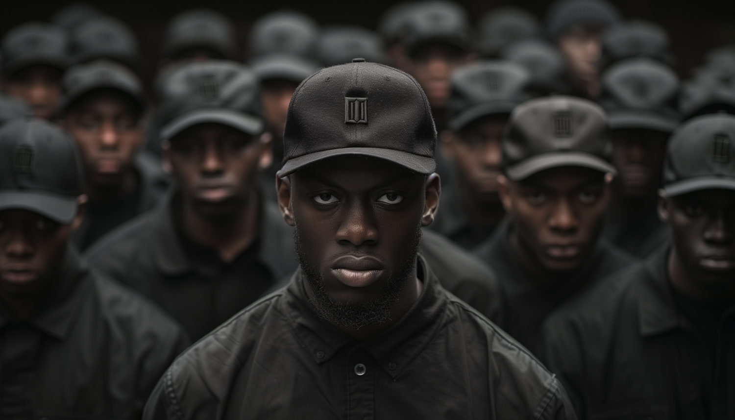 A group of men in black caps and shirts stand together, with a focus on the central figure's intense gaze and serious expression.