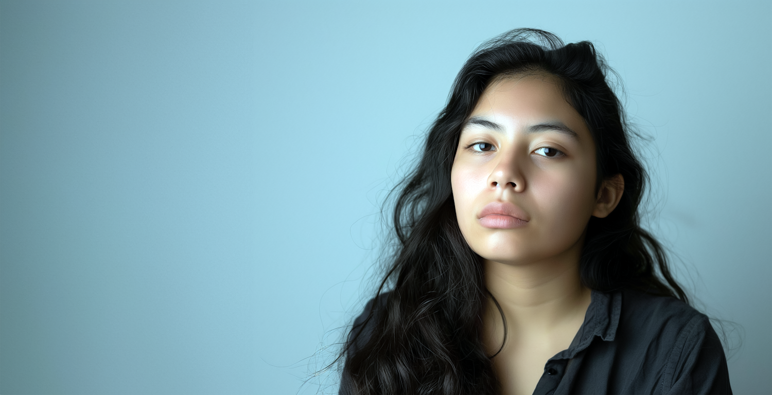 Portrait of a young woman with long black hair and a calm expression against a soft blue background.