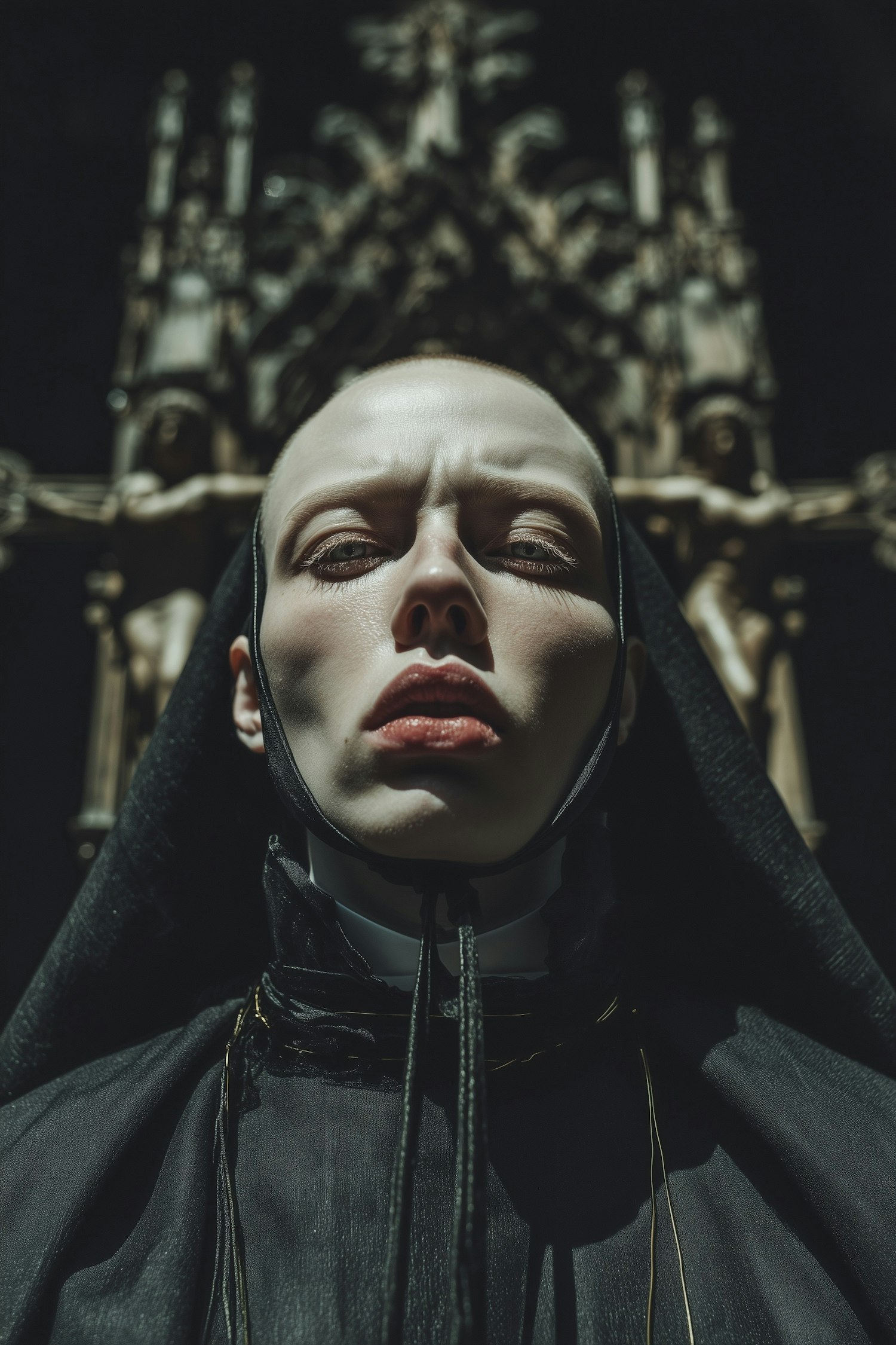 A dramatic close-up of a person in a religious habit with a solemn expression, set against an ornate religious backdrop.