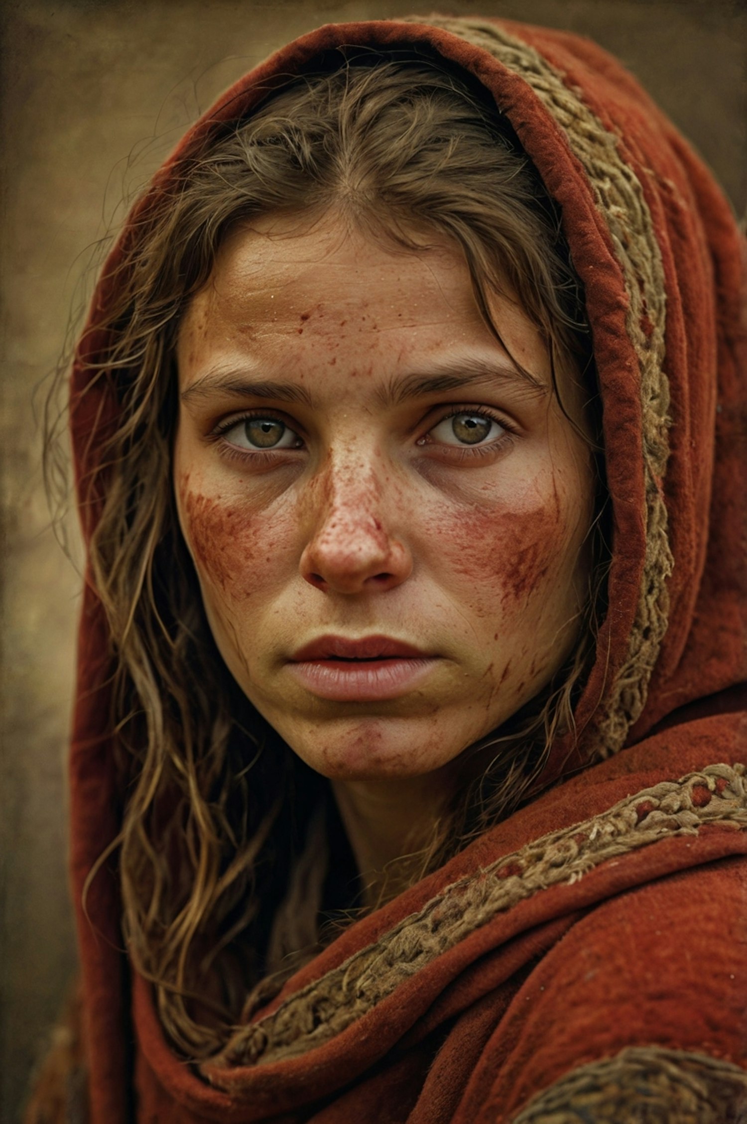 A young woman with green eyes and a reddish-brown cloak gazes intensely, her face marked with dirt and freckles.
