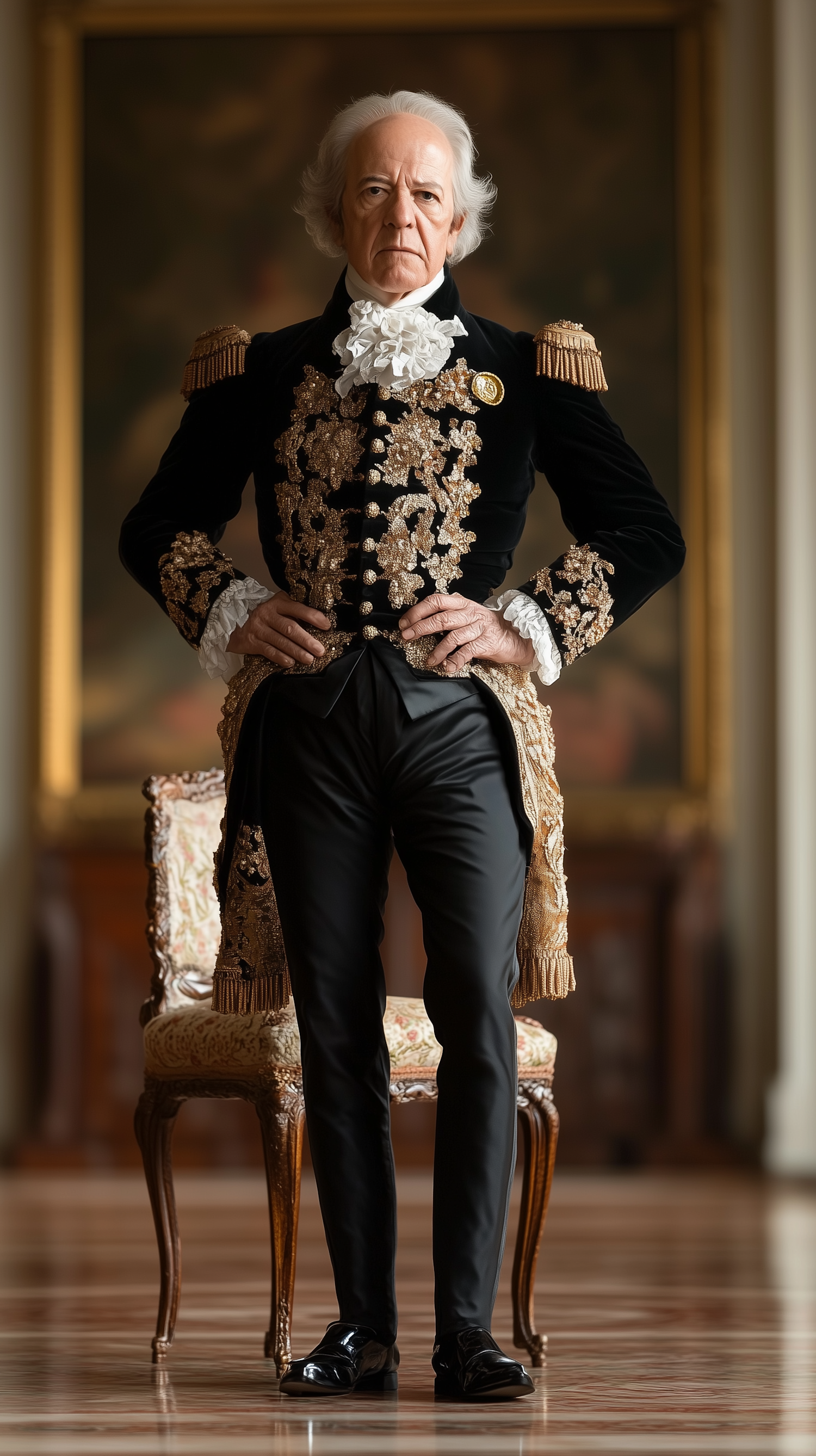 Elderly man in ornate black velvet coat with gold embroidery, standing confidently in a luxurious room with a floral chair.