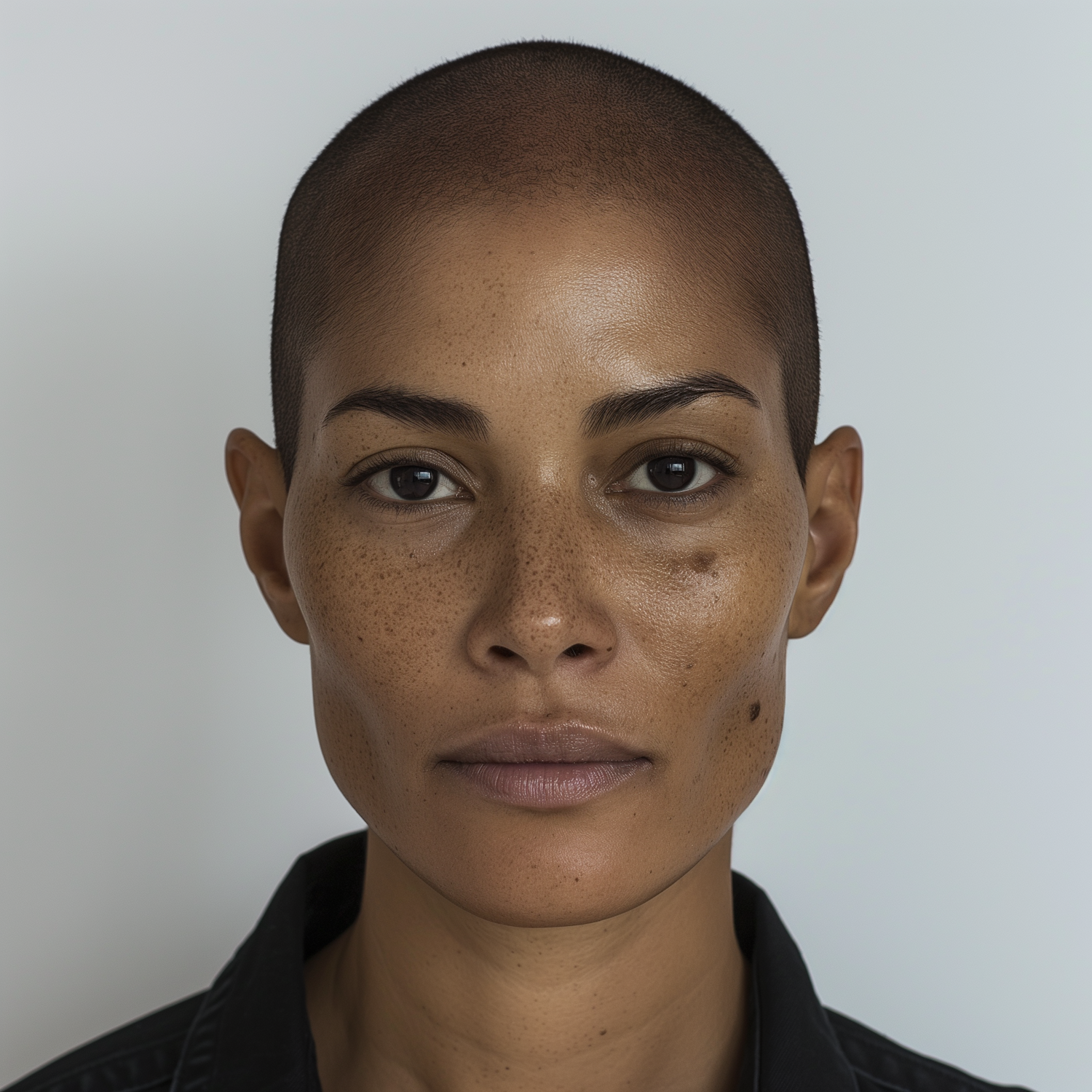 Portrait of a person with a shaved head and freckles, wearing a dark shirt against a light background.