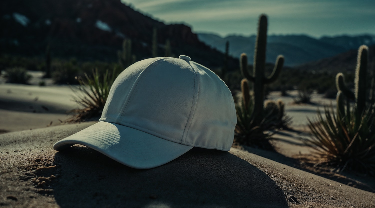 White baseball cap on desert sand surrounded by cacti and shrubs, with mountains and a cloudy sky in the background.