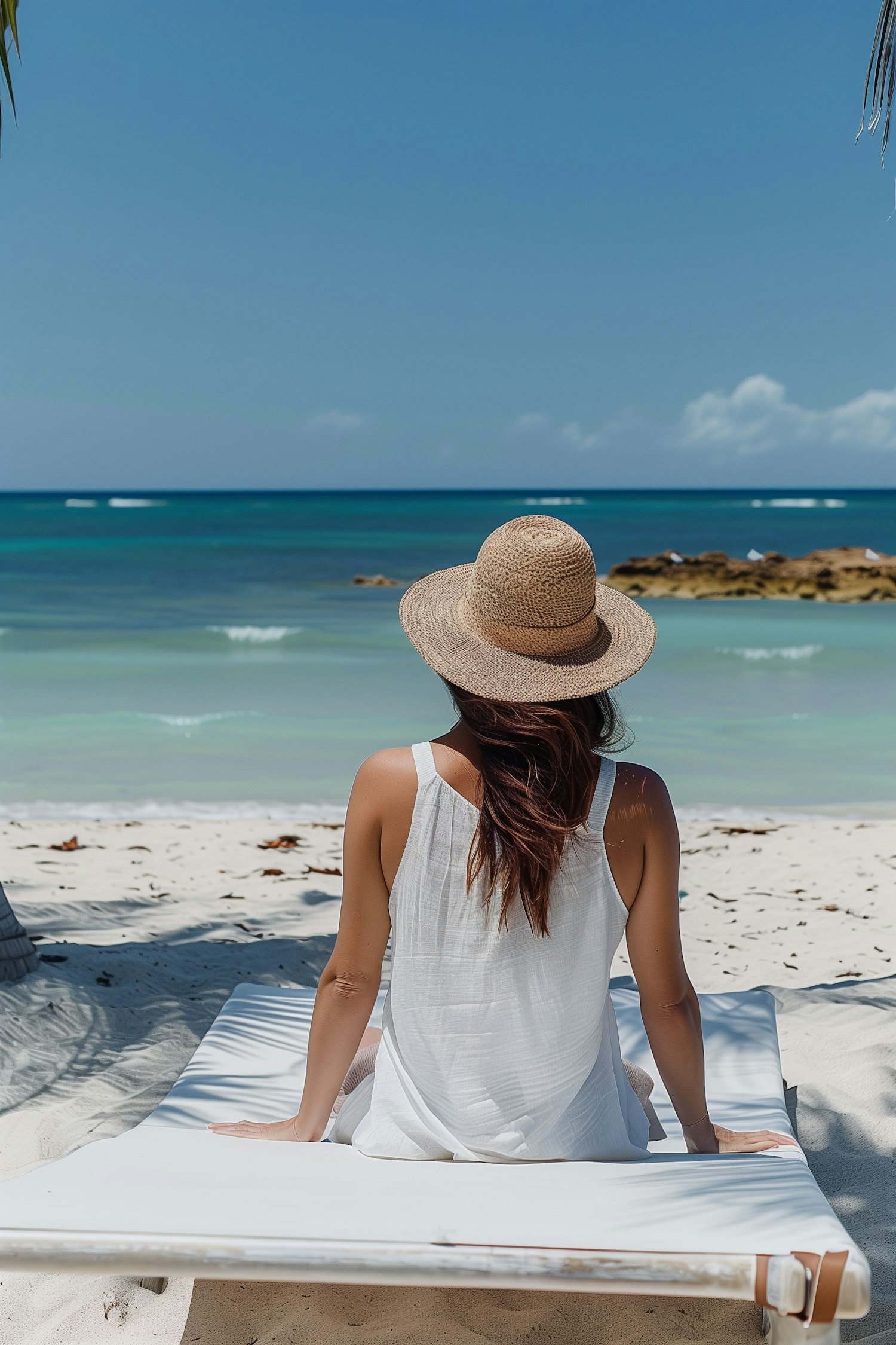 Woman in a straw hat and white dress relaxes on a beach lounger, gazing at the turquoise ocean under a clear blue sky.