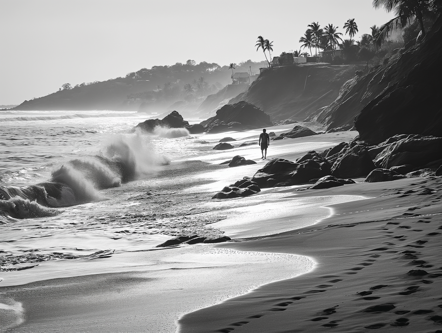 Black and white beach scene with a lone figure walking along the shore, waves crashing, and palm trees in the background.