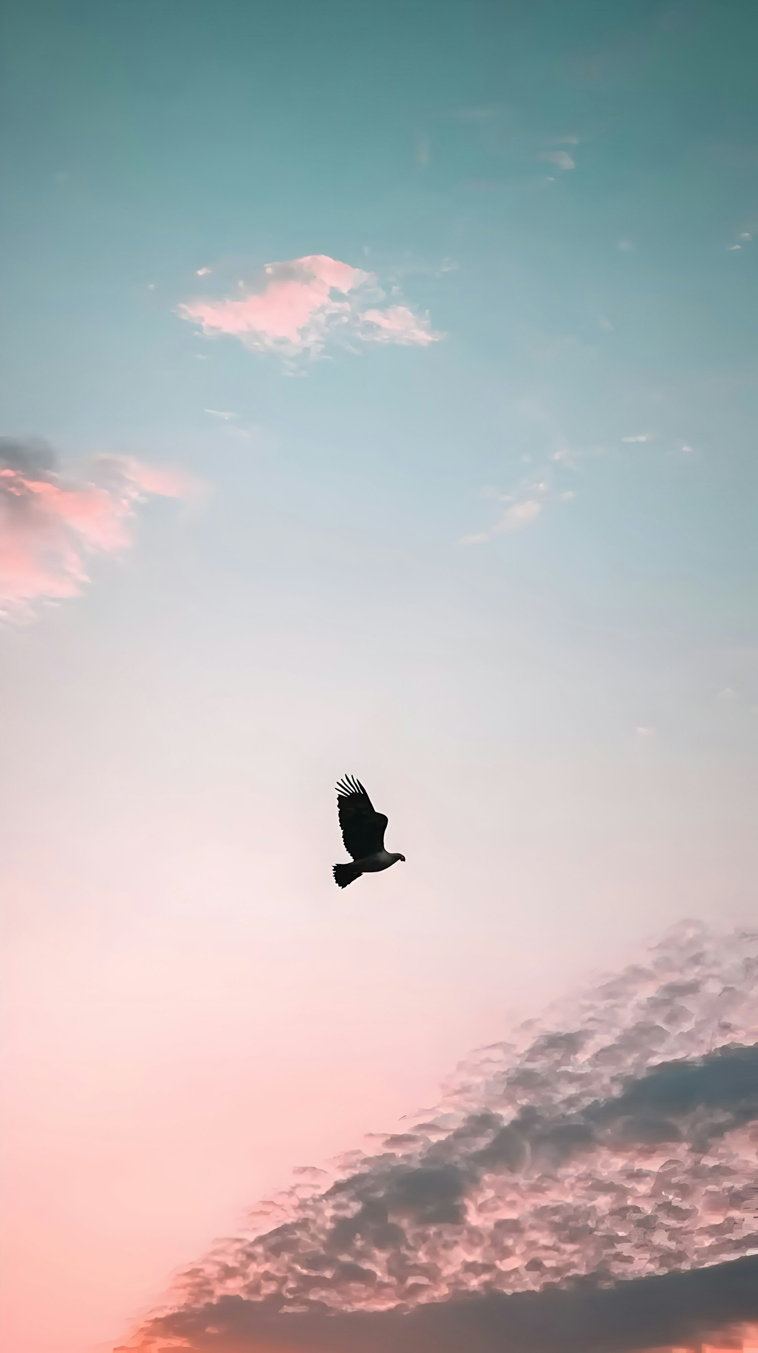 A bird silhouetted against a pastel sky with pink and blue hues, capturing a serene and tranquil moment in nature.