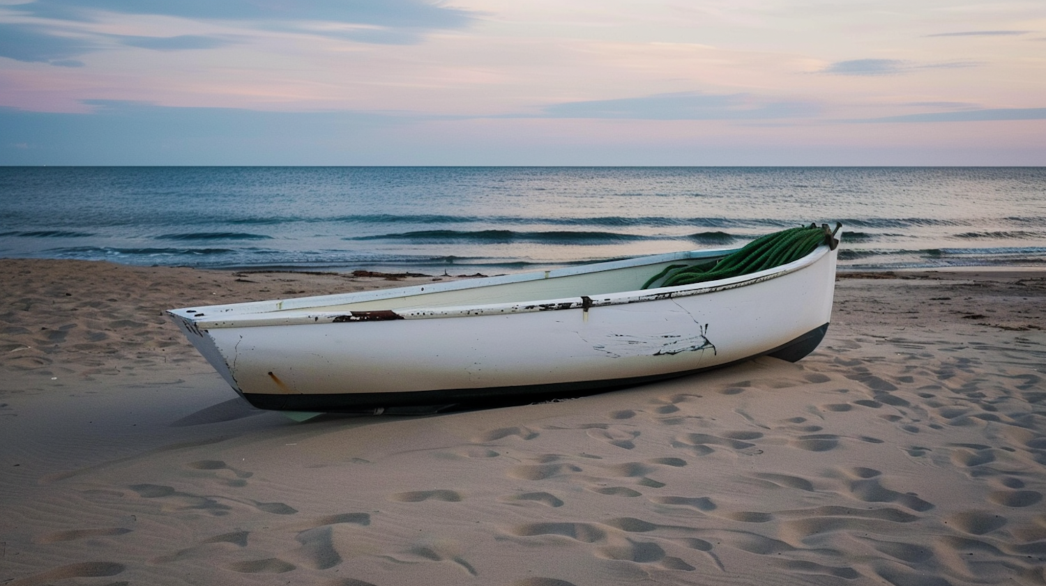 A weathered white rowboat with green rope on a sandy beach, set against a tranquil sea and pastel sky at dawn or dusk.