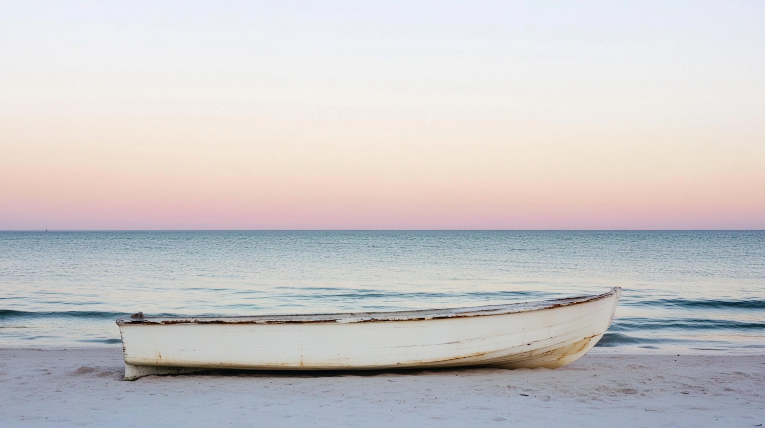 A weathered white boat rests on a tranquil beach with pastel skies and calm ocean waves, creating a serene coastal scene.