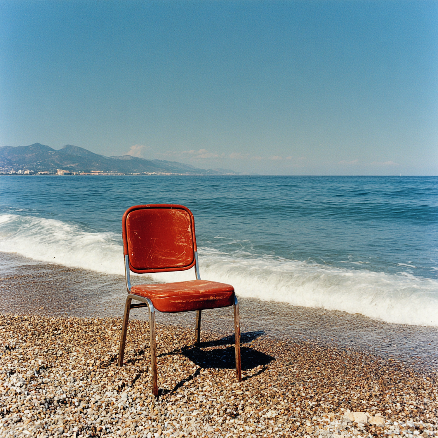 A weathered red chair sits alone on a pebbled beach, with waves and a mountain range in the background under a clear blue sky.