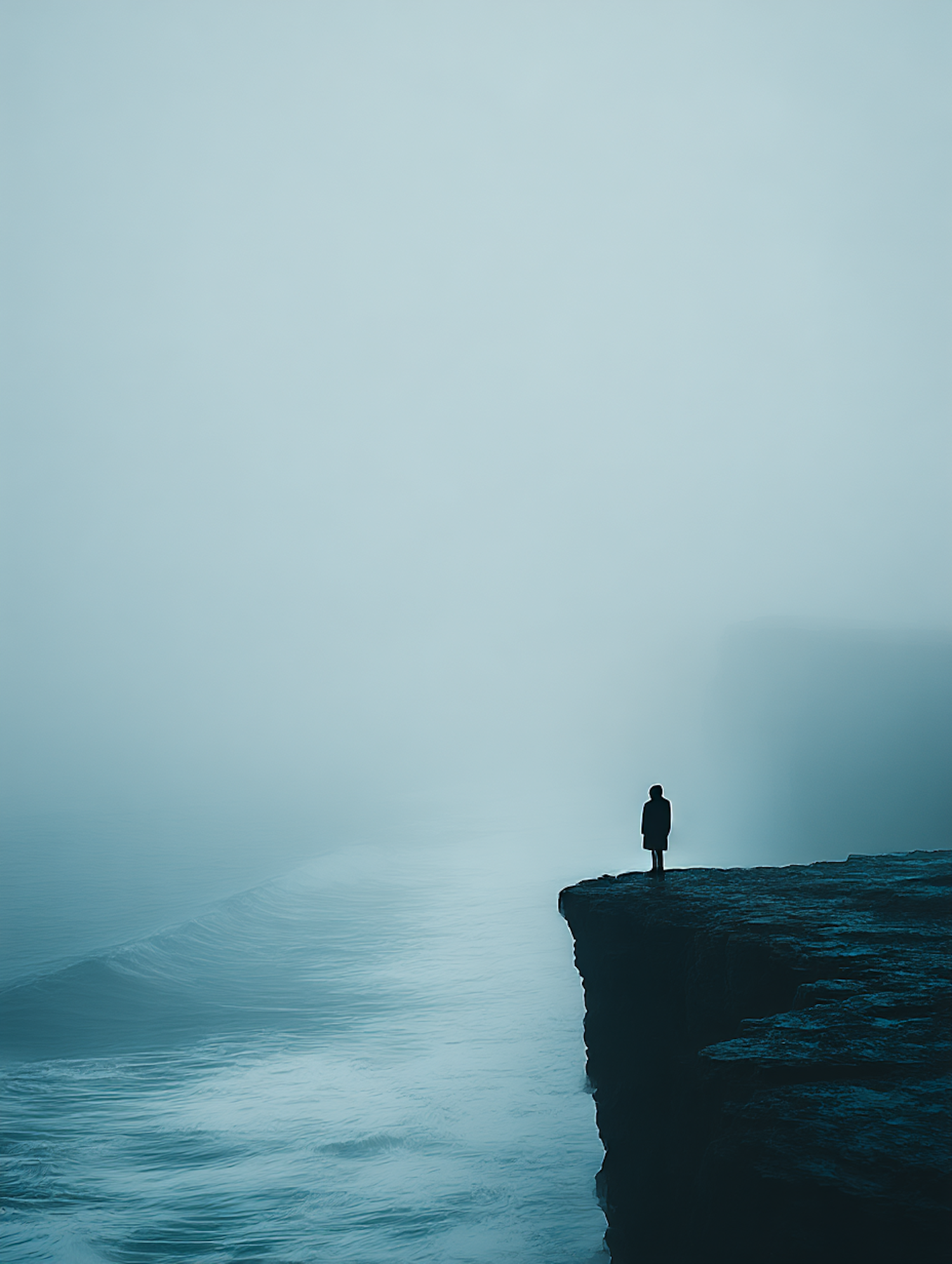 A lone figure stands on a misty cliff edge, overlooking a serene ocean under a blue haze, evoking solitude and introspection.