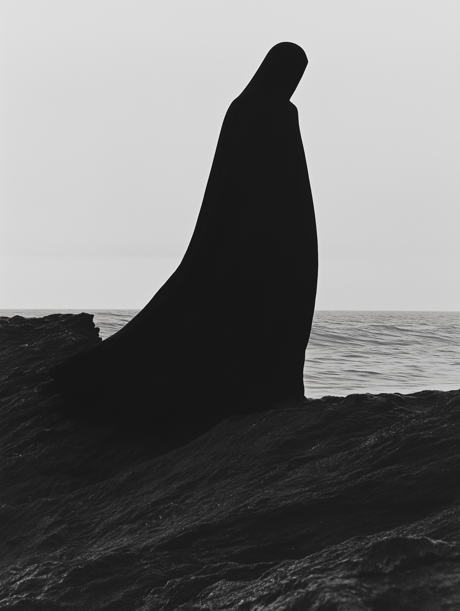 Mysterious silhouette in a cloak stands on rocky terrain by the sea, under a pale sky, creating a stark and enigmatic scene.