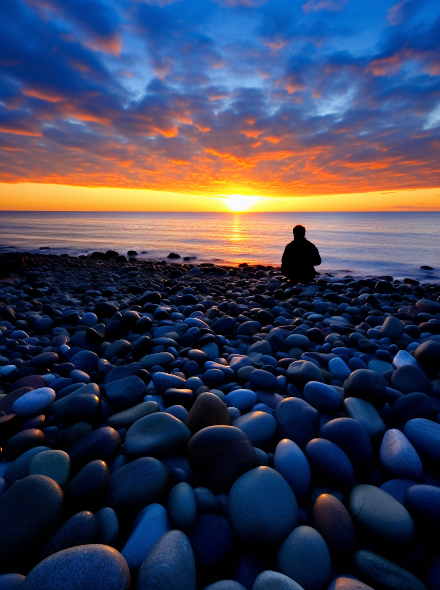 Silhouette of a person sitting on a pebble beach at sunset, with vibrant orange and blue sky reflecting on the calm sea.