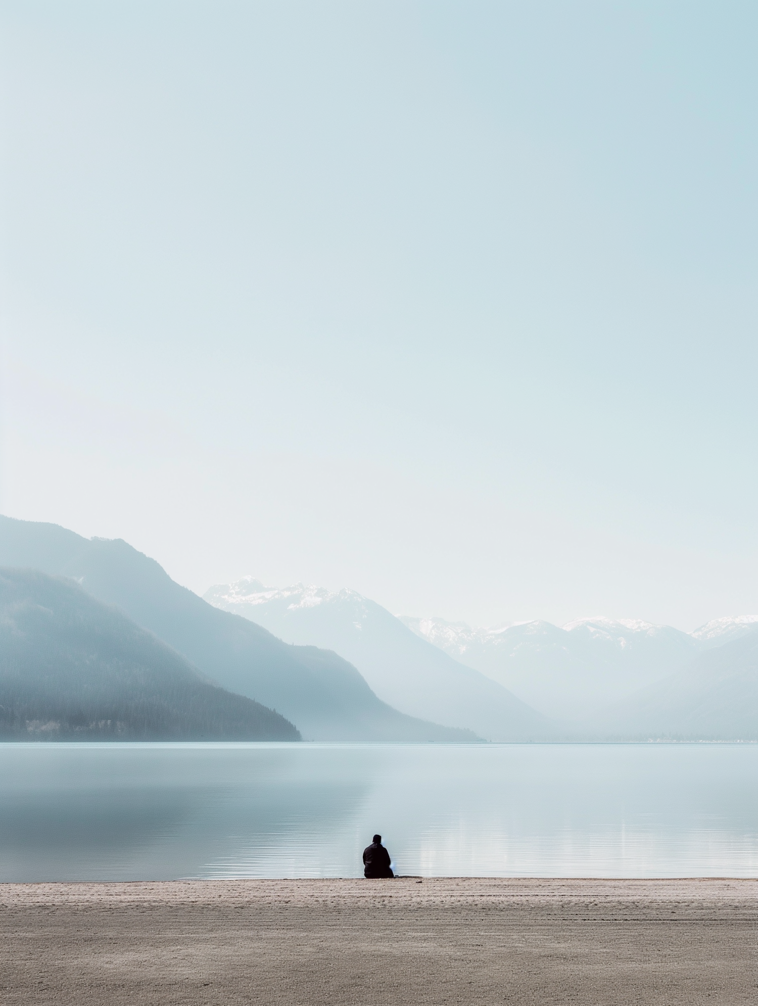 A lone figure sits on a sandy shore, gazing at a tranquil lake with misty mountains in the distance under a pale blue sky.