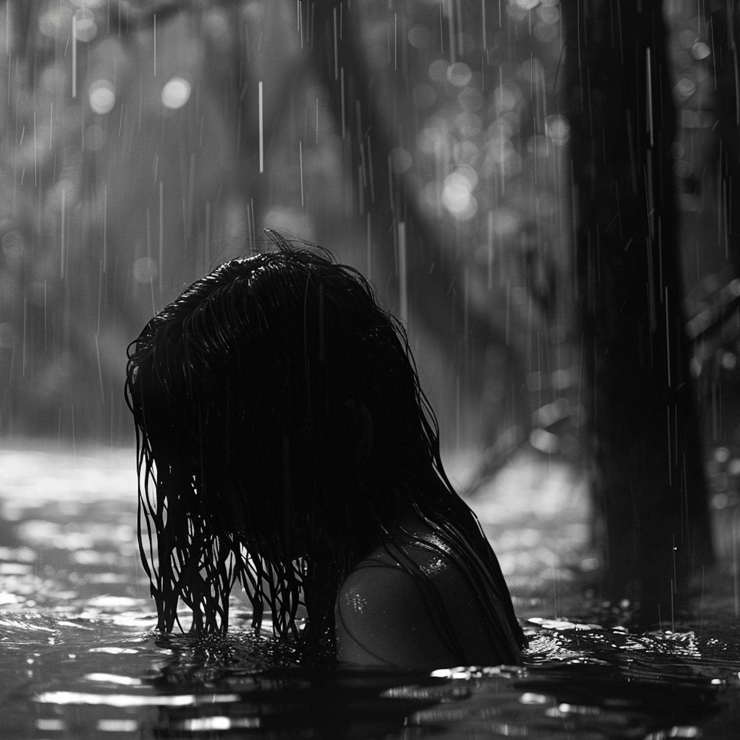 Moody black and white photo of a person in water during rain, with long wet hair and blurred background, creating a dramatic silhouette.
