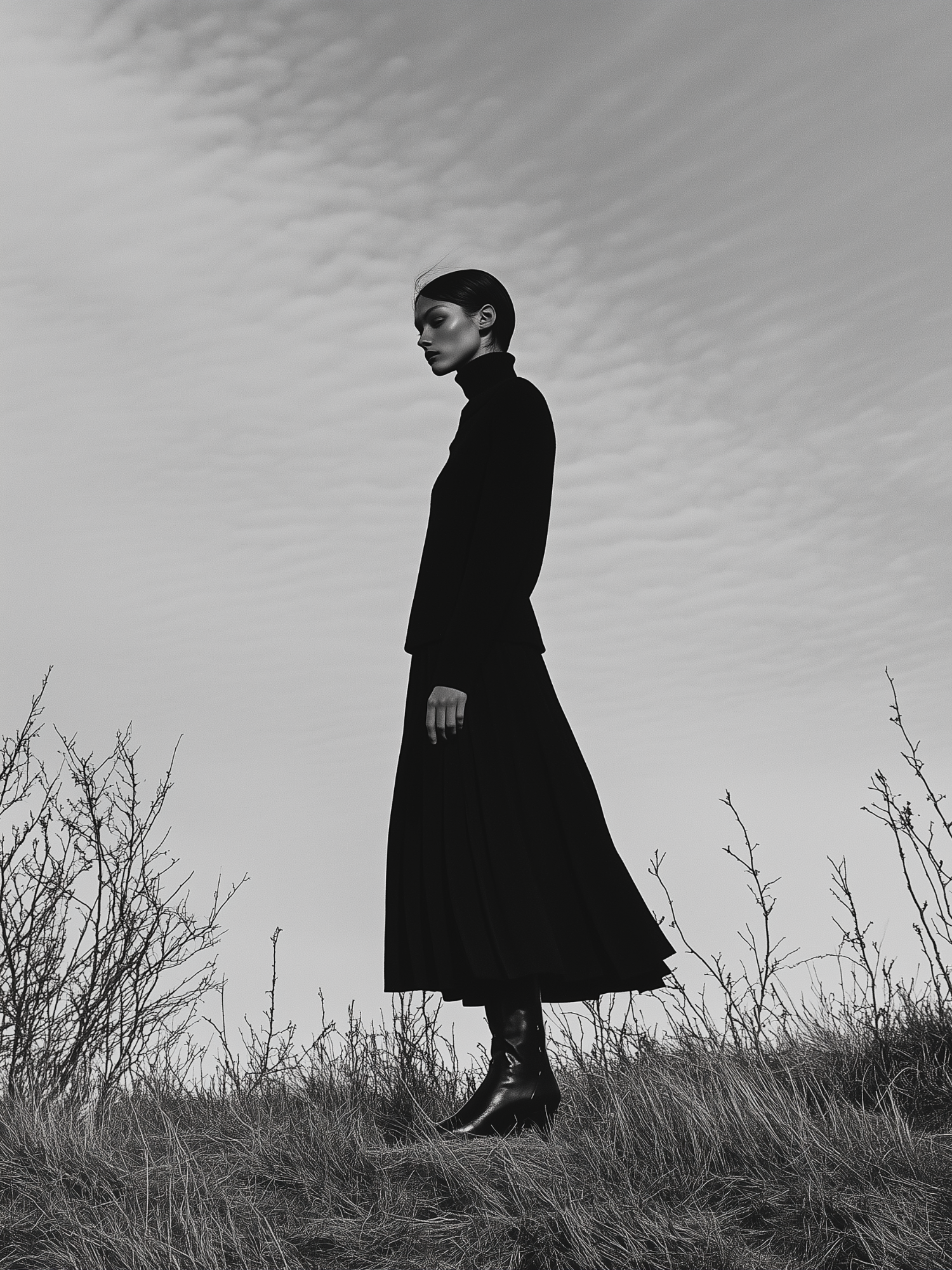 Black and white photo of a woman in a long dress standing in a field, with a dramatic cloudy sky.