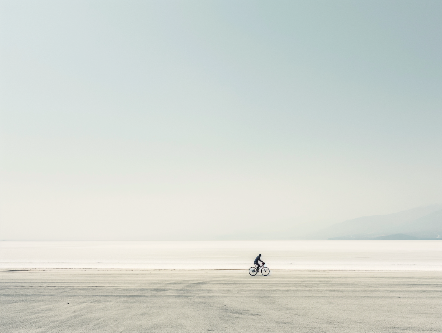 A lone cyclist rides across a vast, serene salt flat under a pale sky, creating a minimalist and tranquil scene.