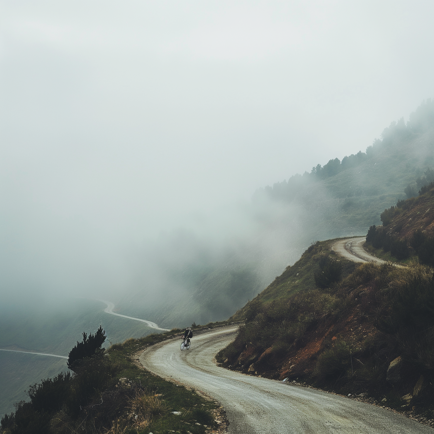 Cyclist on a winding mountain road enveloped in fog, creating a mysterious and adventurous atmosphere.
