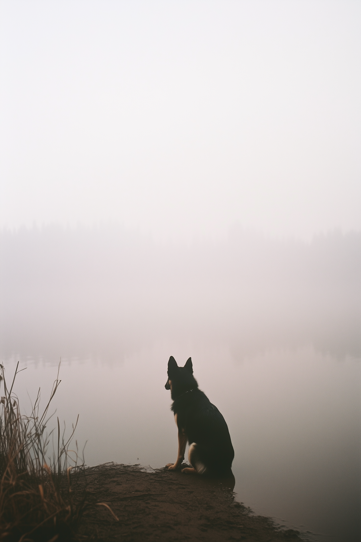 A dog sits by a misty lake, gazing into the fog. Serene and contemplative scene with muted colors and a calm atmosphere.
