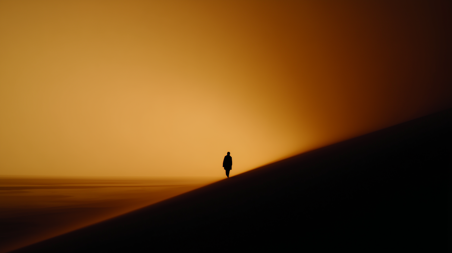 A silhouette of a person on a dune against a gradient orange sky, evoking solitude and serenity in a minimalist desert scene.