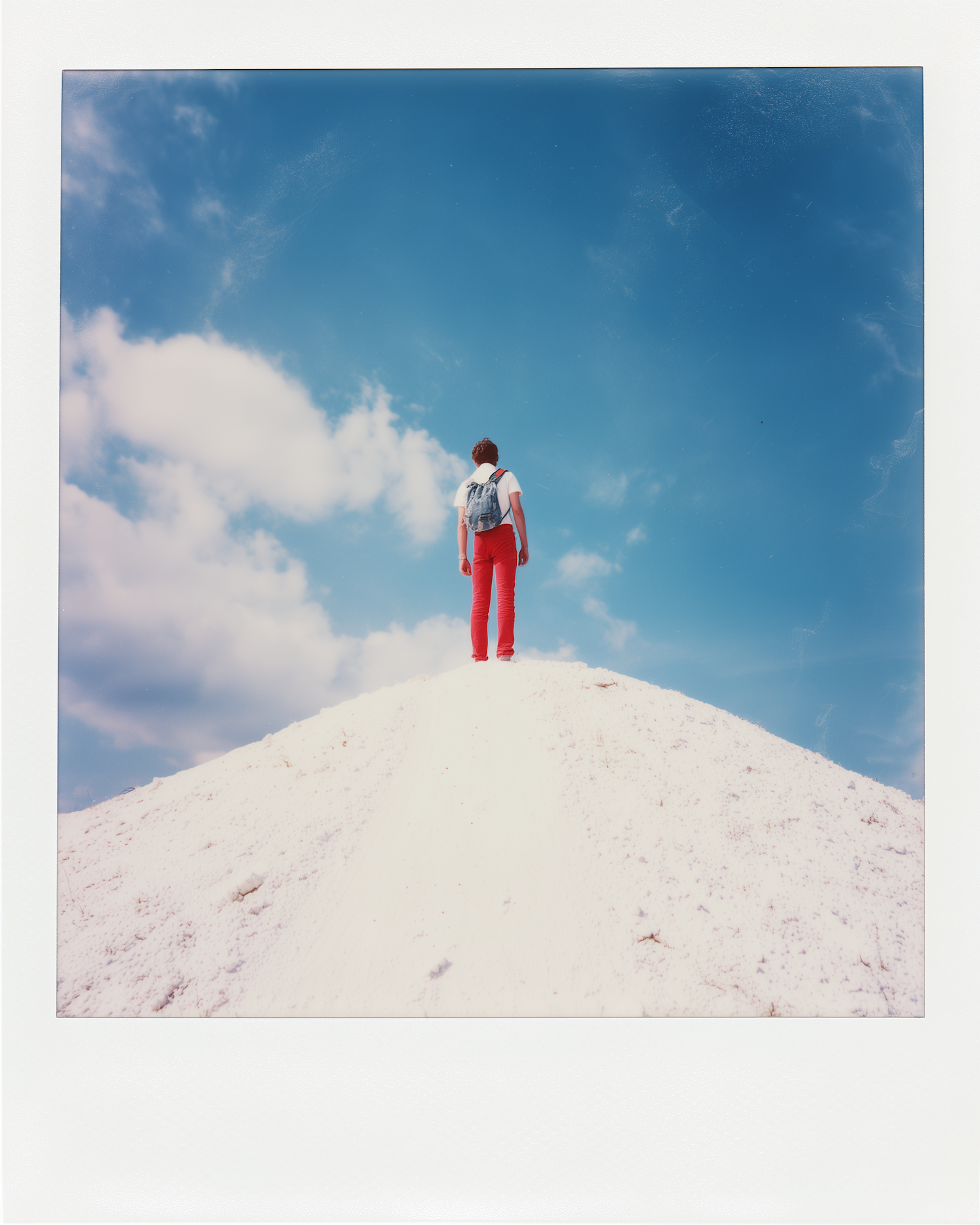 A person in red pants and a backpack stands on a white hill under a bright blue sky, evoking a sense of adventure and freedom.