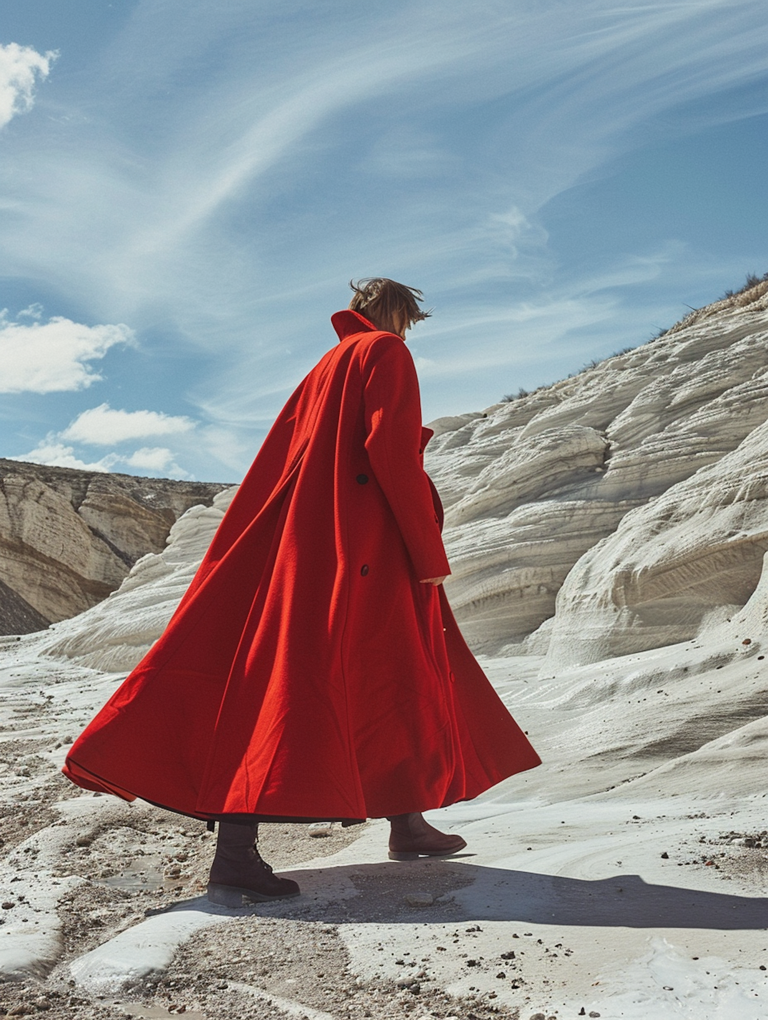 Person in a flowing red coat walking through a rocky landscape under a vibrant blue sky, embodying exploration and boldness.