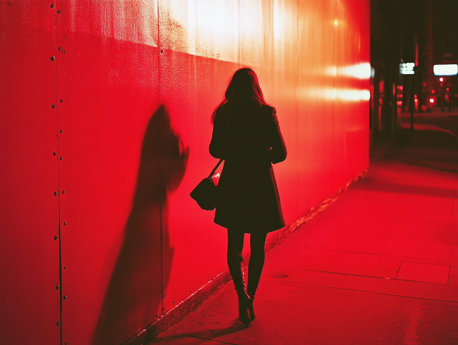 A person walks along a red-lit street, casting a shadow on a vibrant wall, creating a dramatic and moody urban scene.