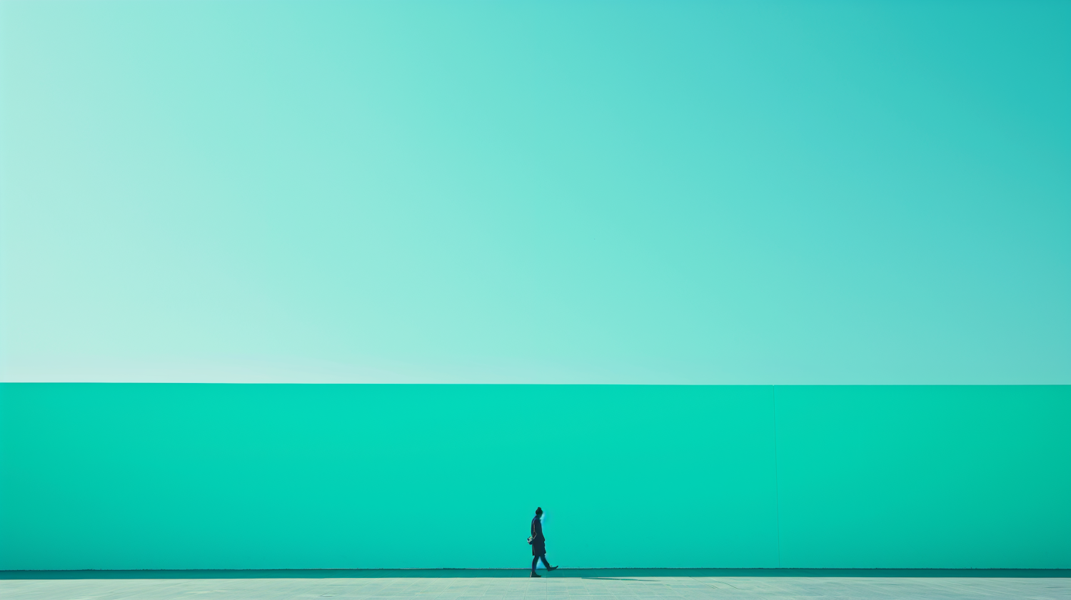 Minimalist scene with a turquoise wall and sky, featuring a solitary figure walking, creating a striking color contrast.