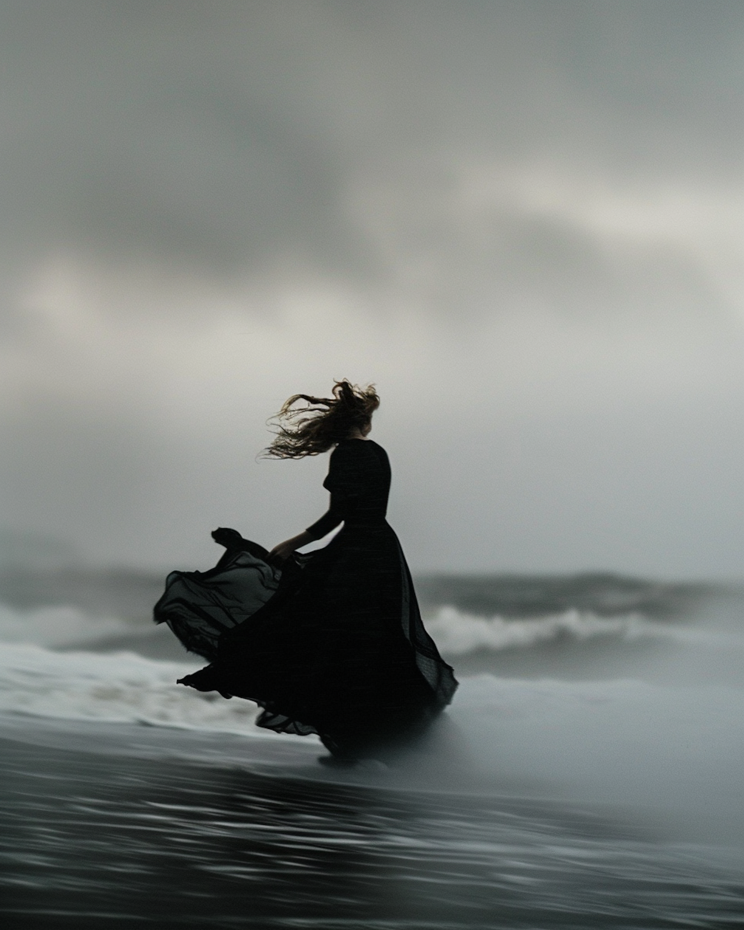 A solitary figure in a flowing black dress stands on a windswept beach, facing the stormy sea under an overcast sky.