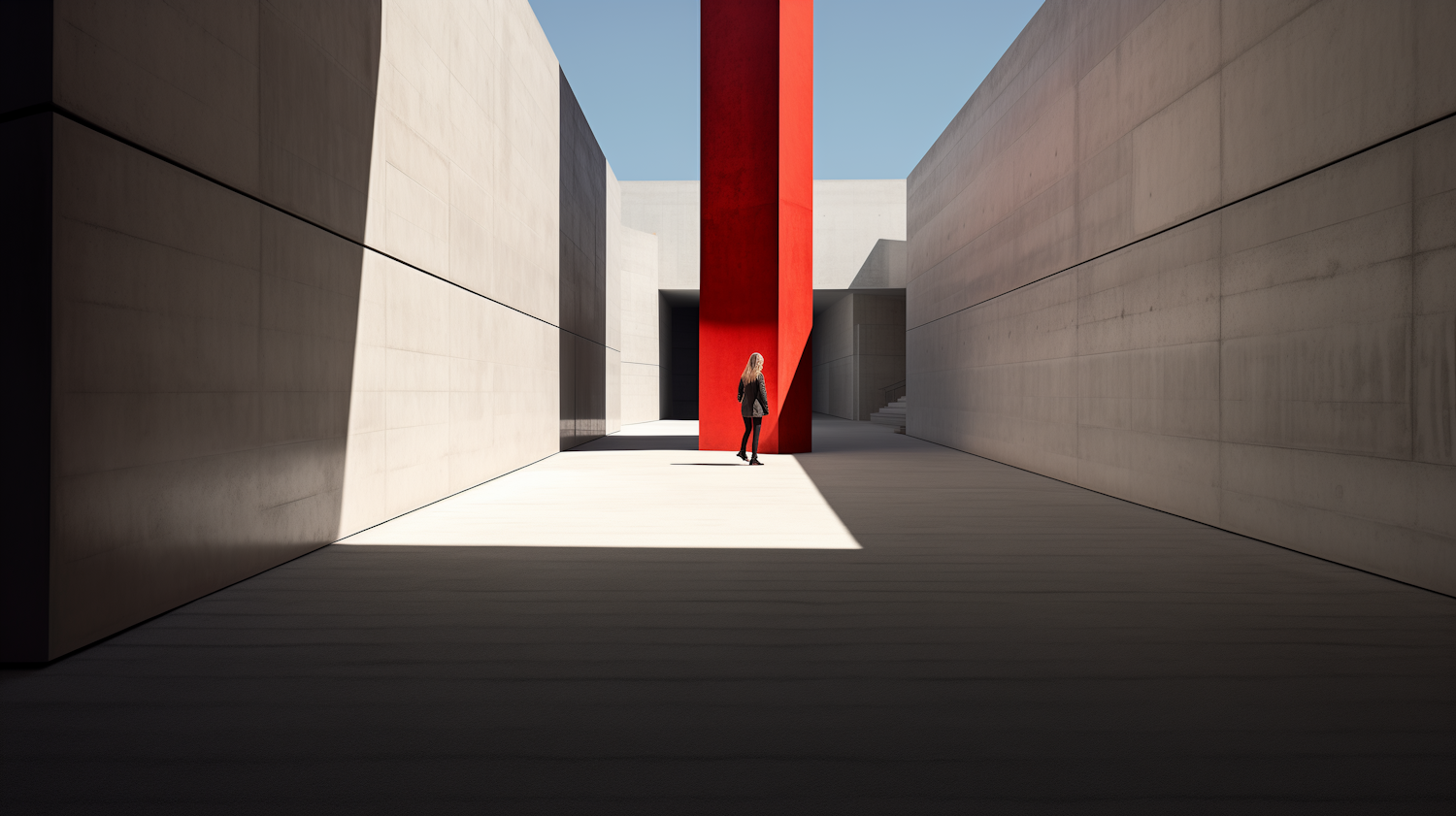 Minimalist architecture with a striking red pillar and a solitary figure in a modern, open space.