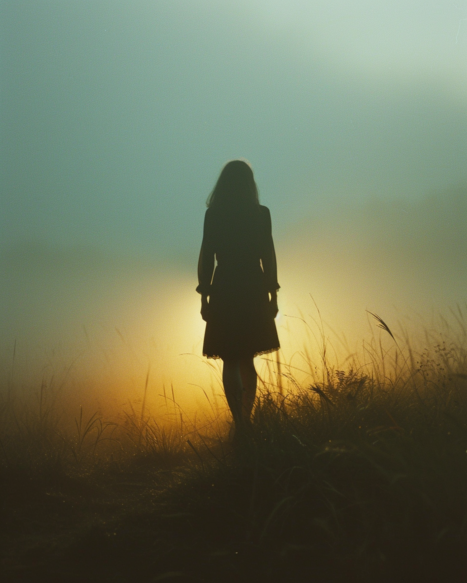 Silhouette of a person in a field at sunrise or sunset, with golden light and tall grass creating a serene, ethereal atmosphere.