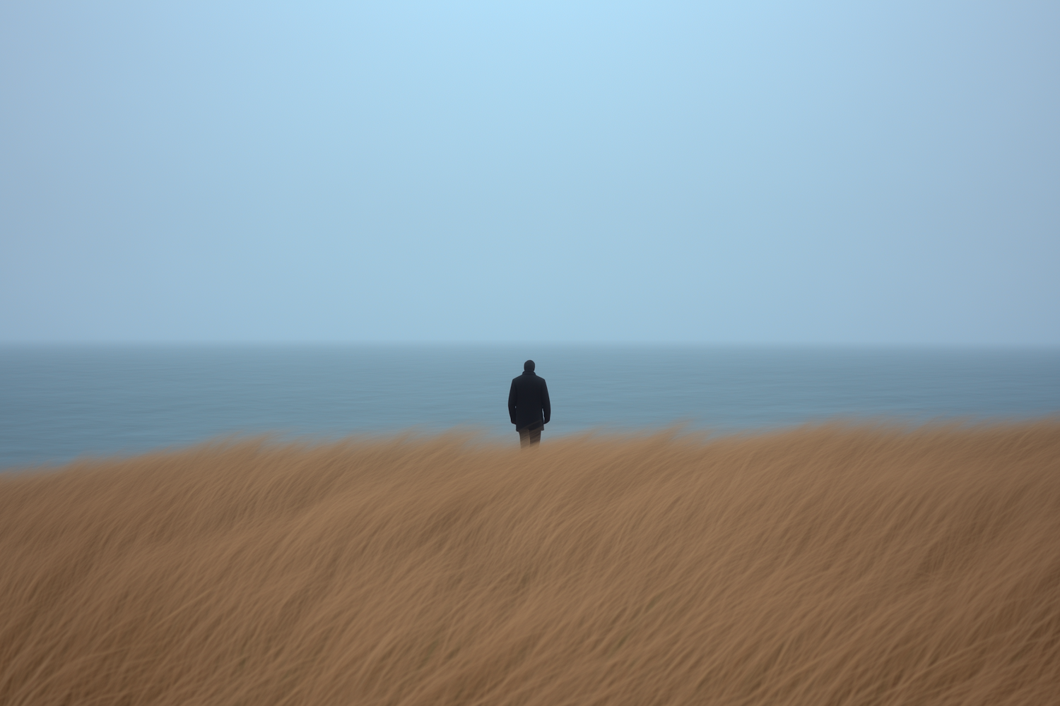 A lone figure stands by the ocean, surrounded by swaying golden grasses under an overcast sky, evoking solitude and introspection.
