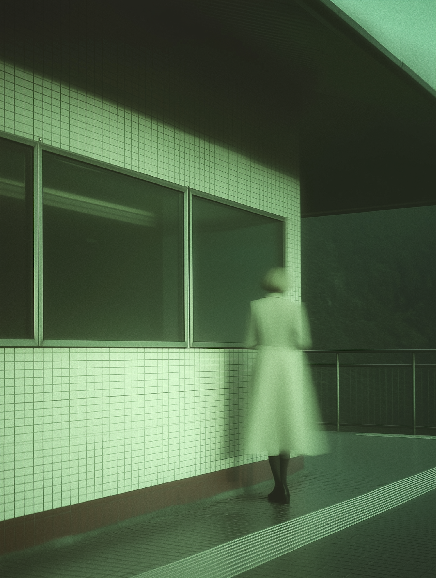 A mysterious, blurred figure in a green-tinted scene stands by a tiled building, creating an eerie, minimalist atmosphere.