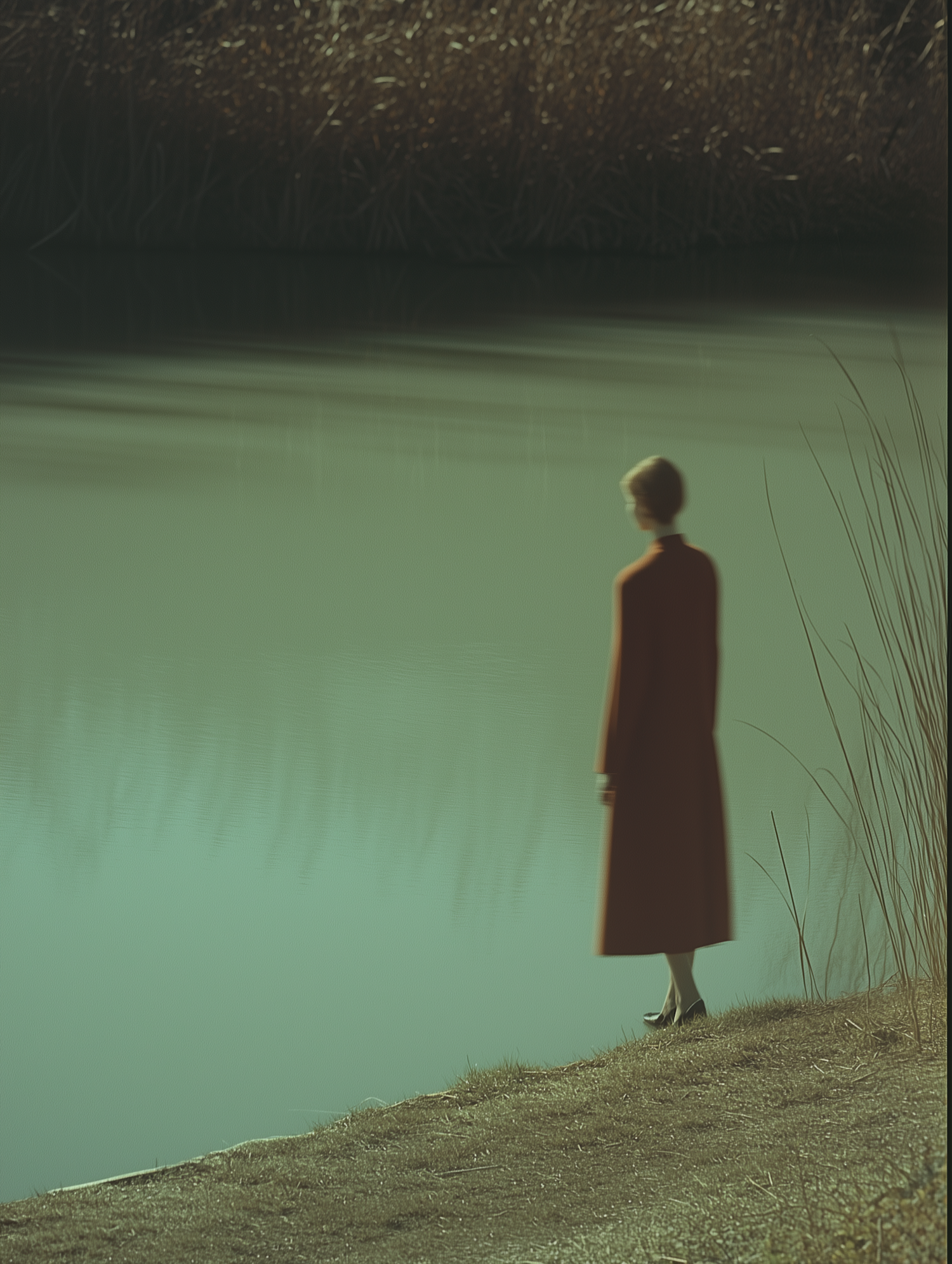 A woman in a red coat stands contemplatively by a tranquil lake, surrounded by reeds and muted colors.