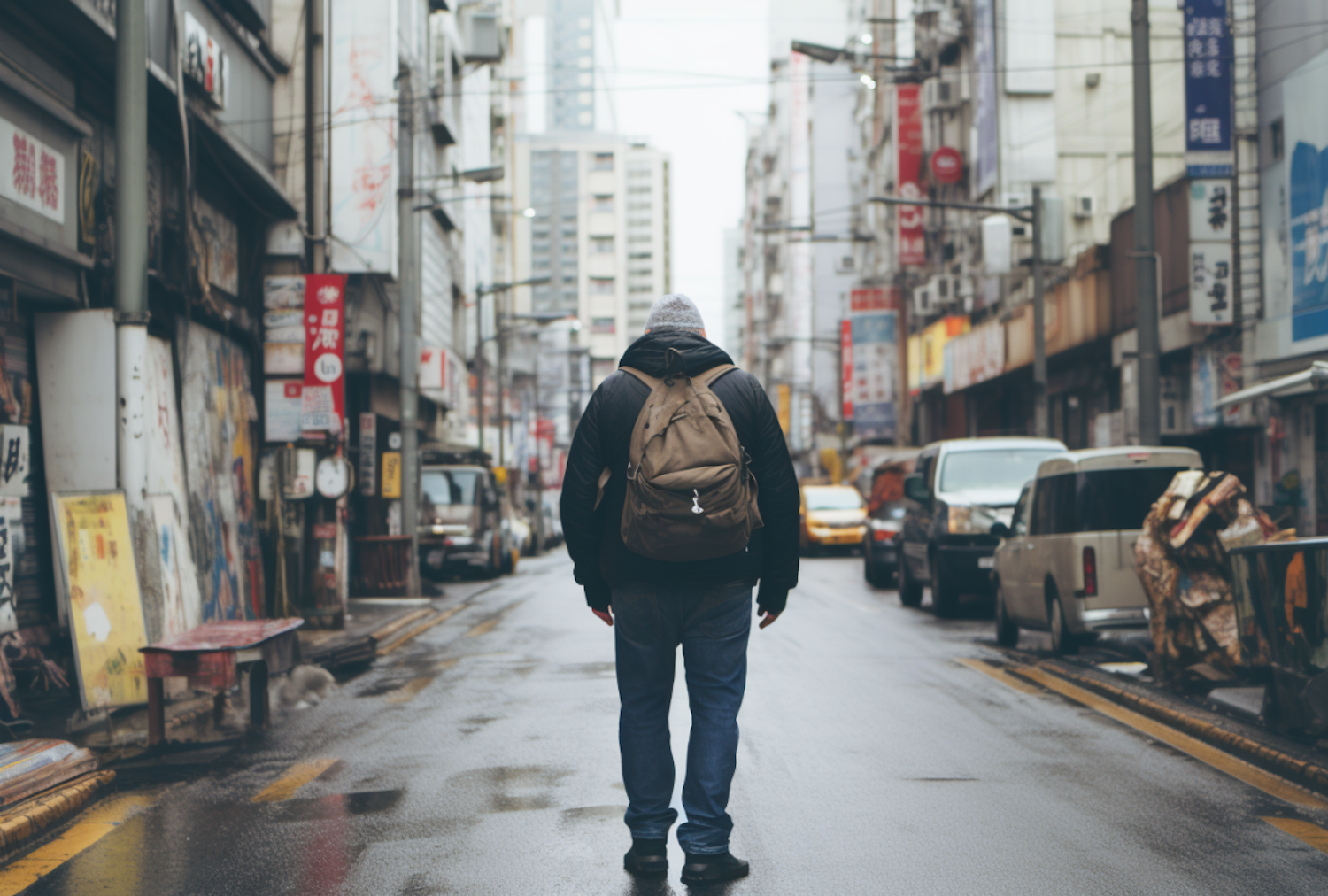 Person with backpack stands in a rainy Asian city street, surrounded by shops and vehicles, creating a sense of urban exploration.