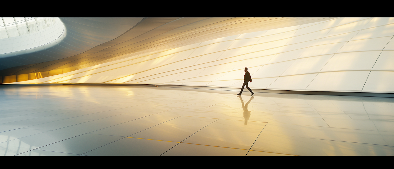A lone figure walks in a modern, spacious architectural space with golden light and sleek, curved walls.