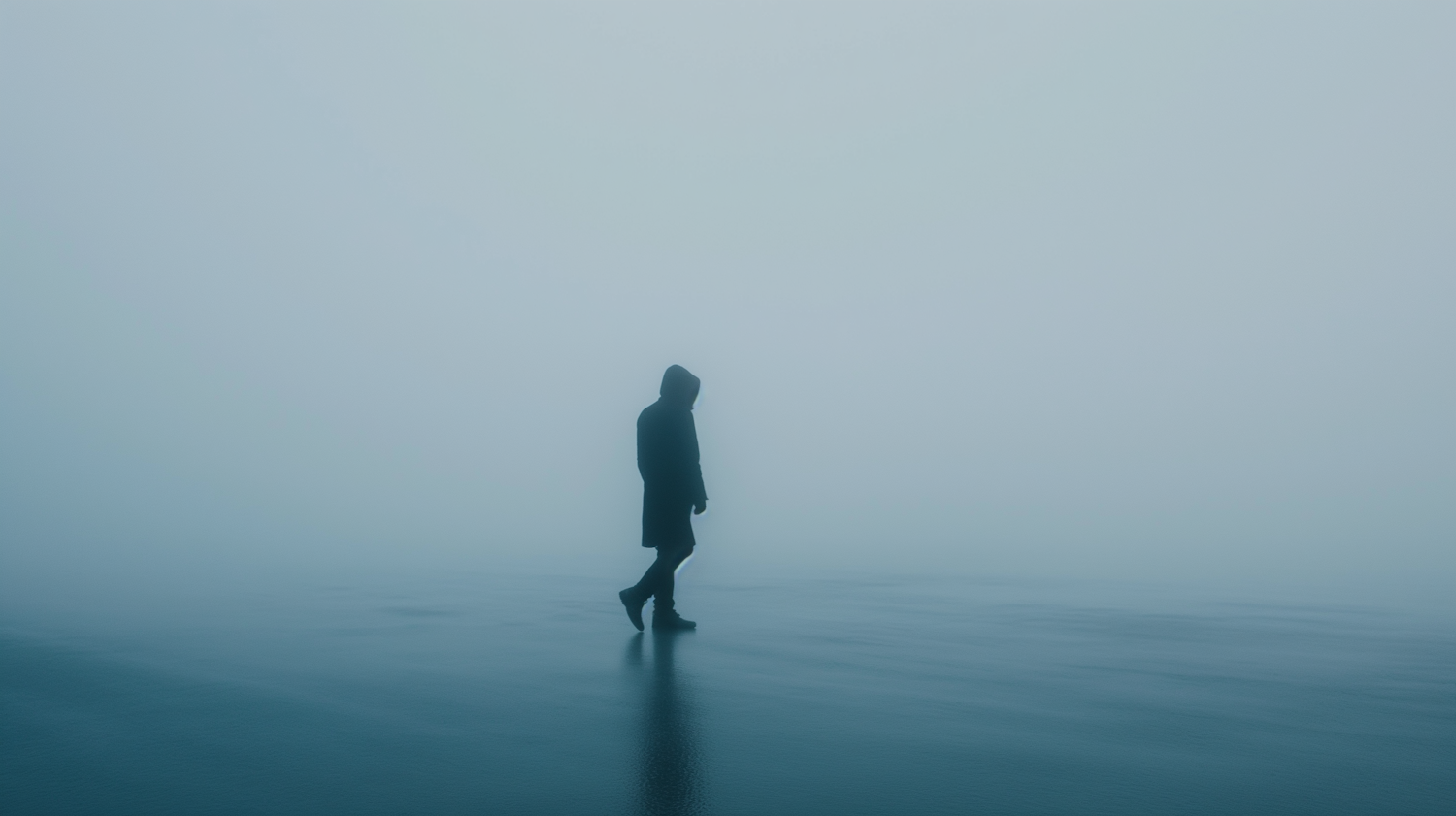 A lone figure in a hooded coat walks through a foggy, desolate landscape, evoking solitude and mystery in muted blue-gray tones.