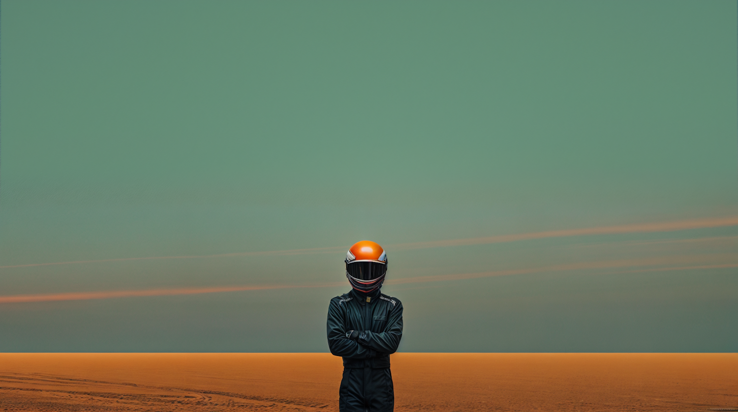 A lone figure in a racing suit and helmet stands in a vast, surreal landscape with a green sky and orange ground.
