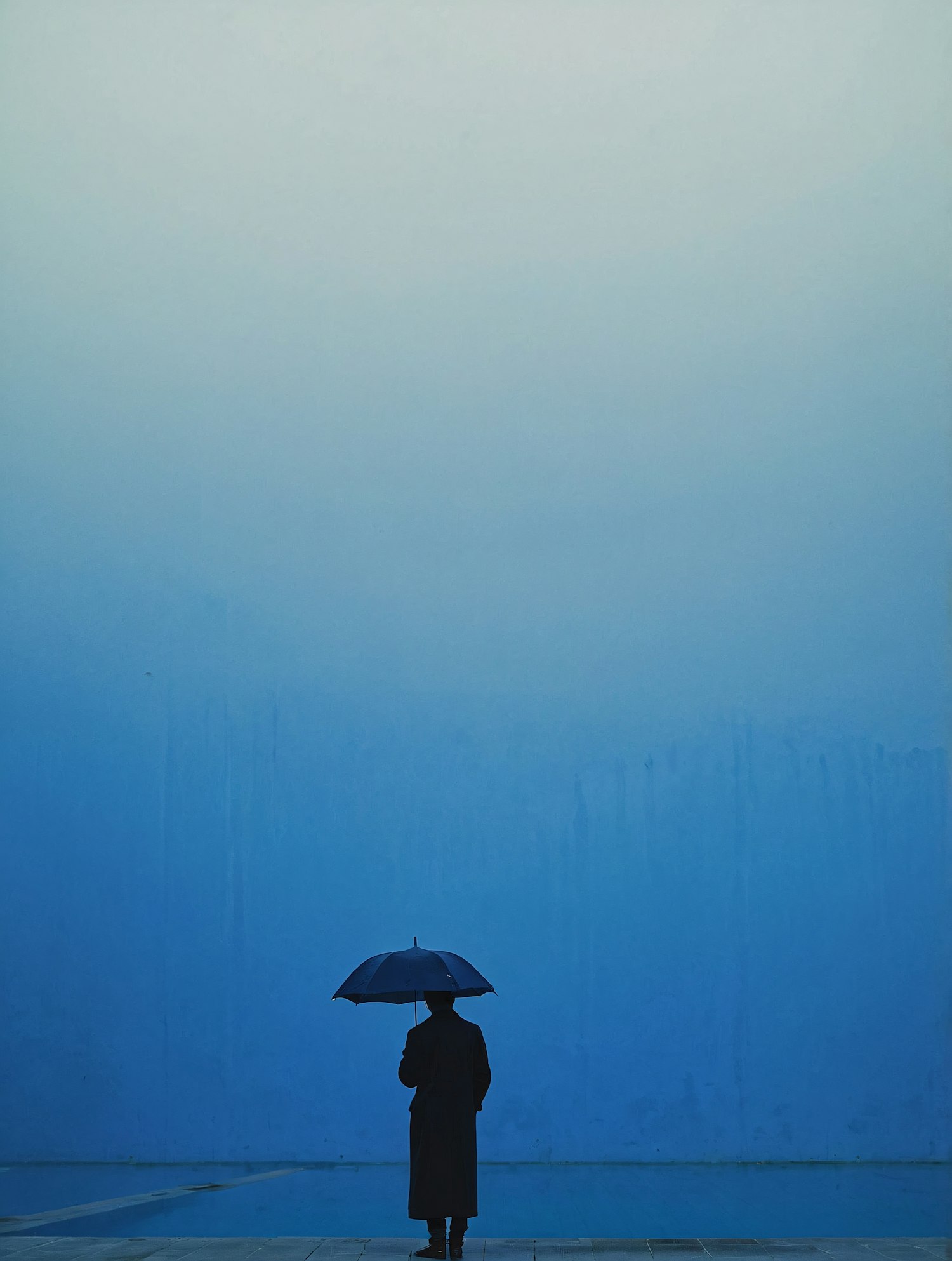 A lone figure with an umbrella stands against a serene blue gradient background, evoking solitude and minimalism.