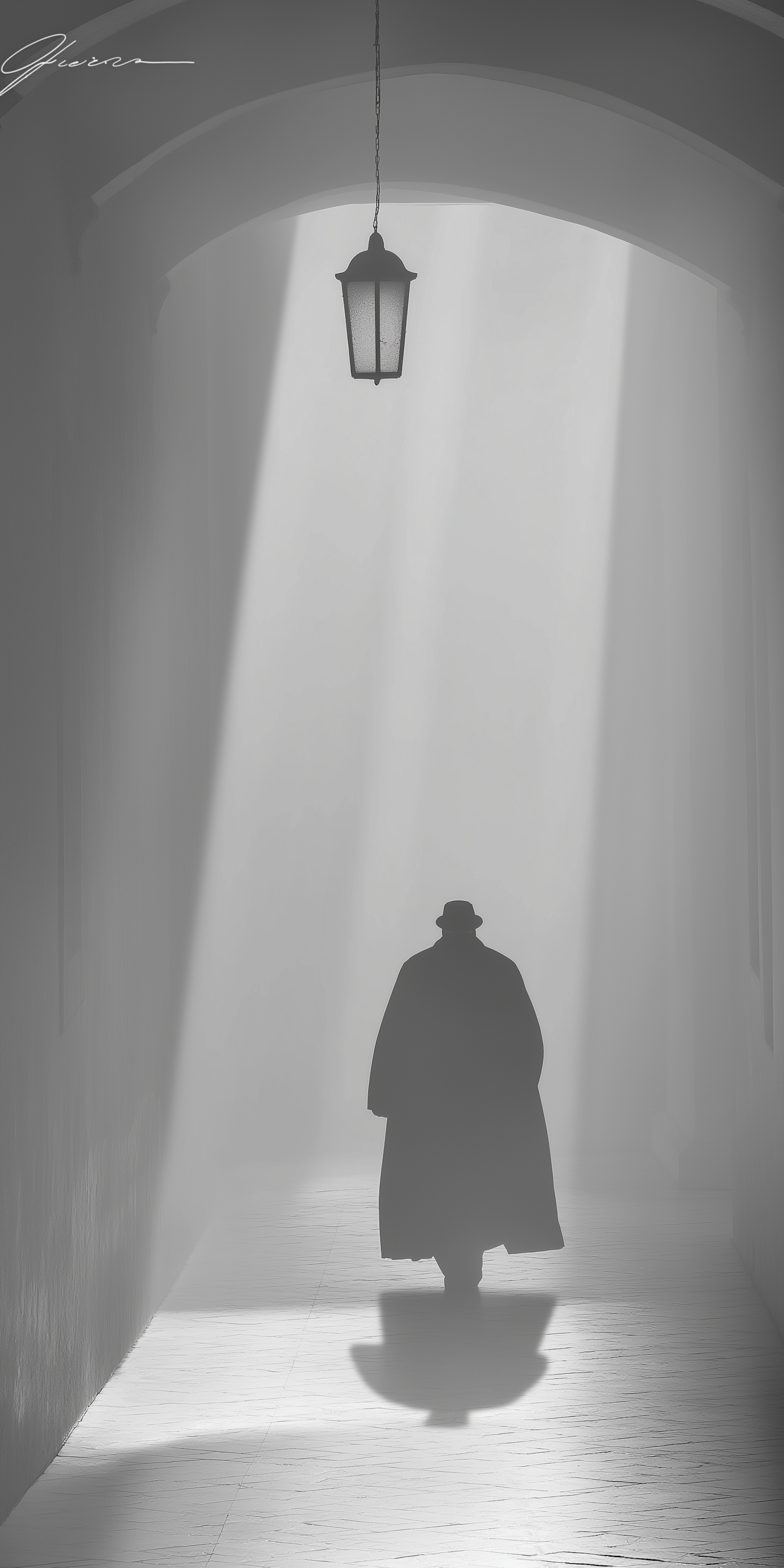 A mysterious figure in a long coat walks through a dimly lit corridor, casting shadows under a hanging lantern.