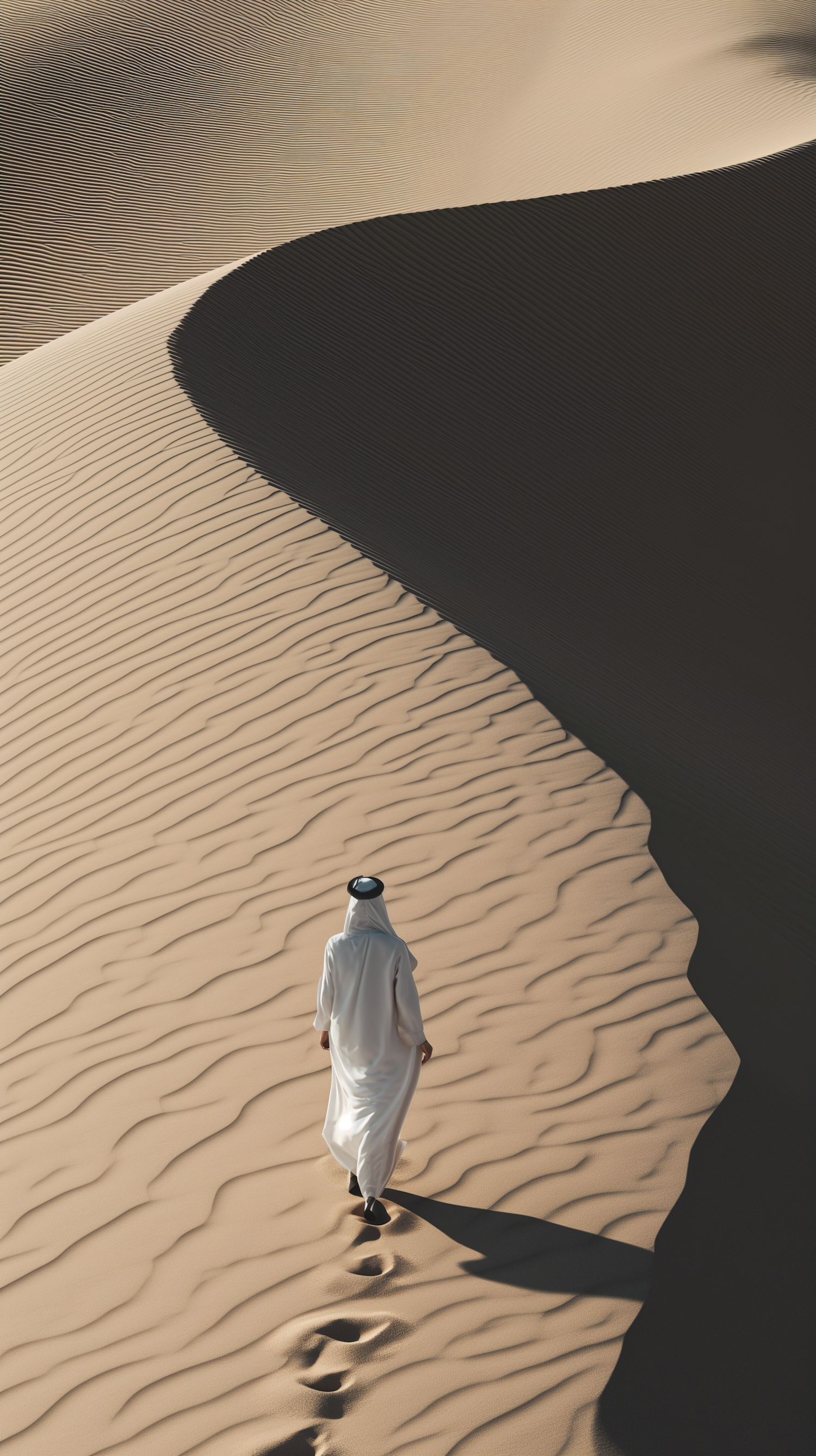 Person in traditional attire walking across sunlit desert dunes, leaving footprints. Striking light and shadow contrast on sand.