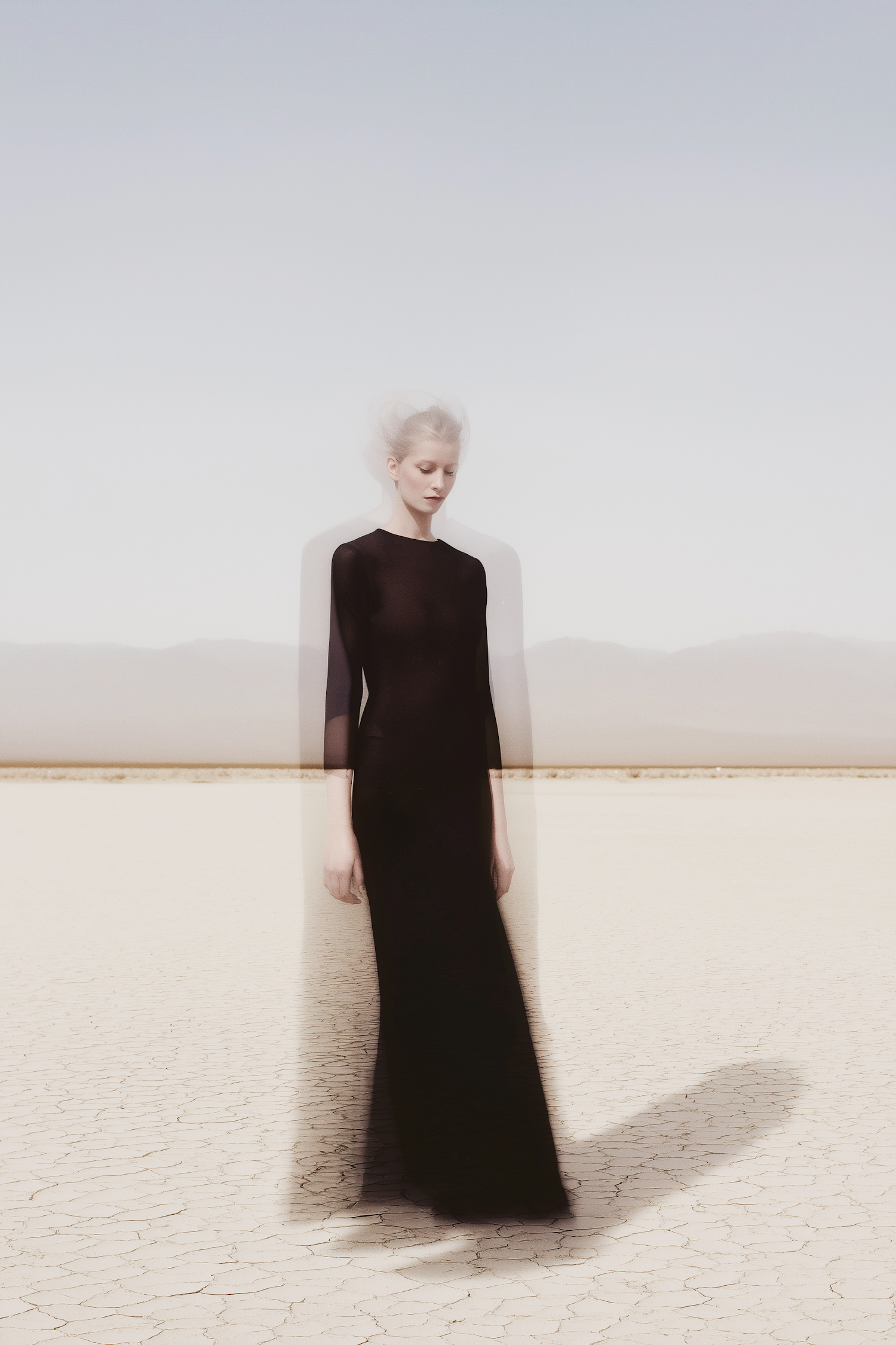 Ethereal woman in a black dress stands in a vast desert, with a ghostly blur effect creating a surreal, dreamlike atmosphere.