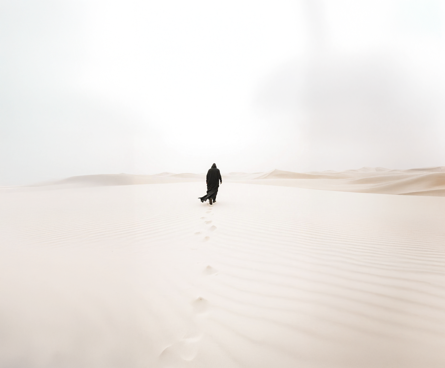 A lone figure in a dark cloak walks across a vast, rippled desert under an overcast sky, leaving a solitary trail of footsteps.