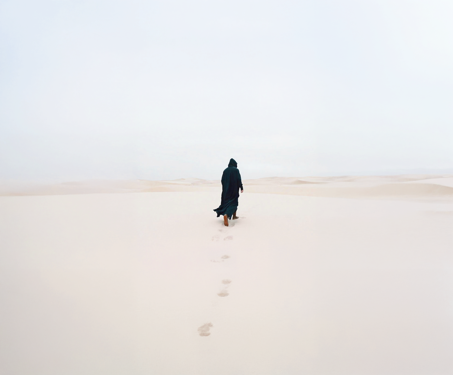 A lone figure in a dark cloak walks across a vast, empty desert, leaving footprints in the sand under an overcast sky.