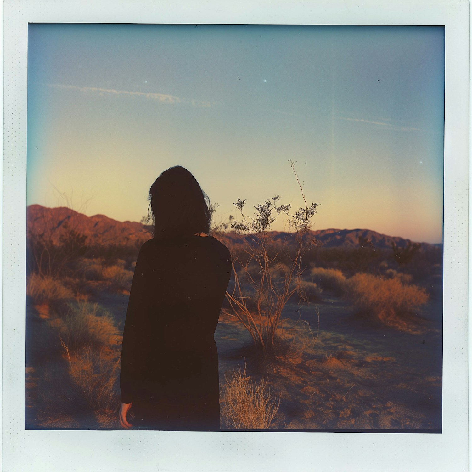A person in black stands in a serene desert landscape at sunset, surrounded by sparse vegetation and distant mountains.
