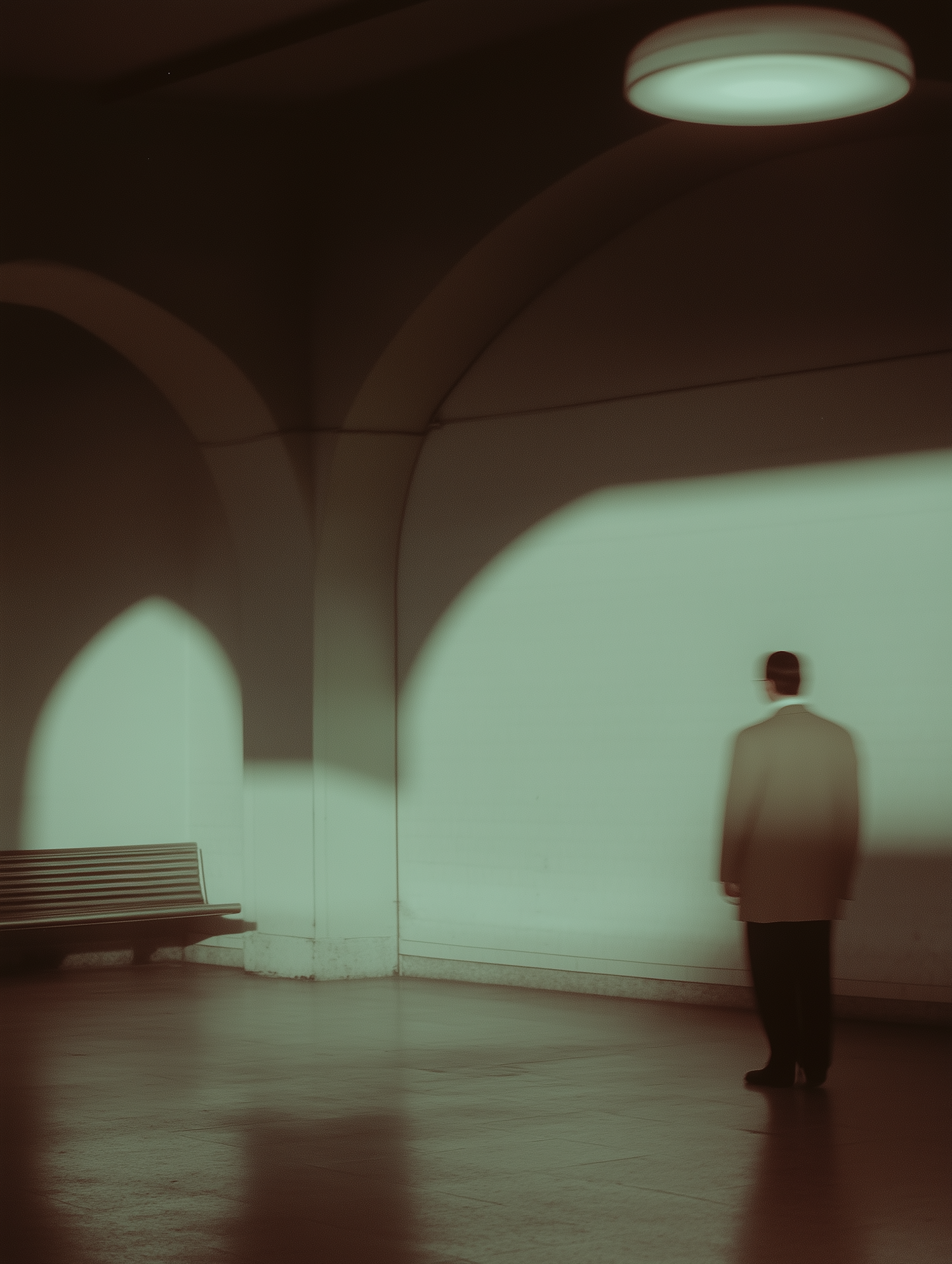 Blurred figure in a dimly lit room with arched walls, soft shadows, and muted colors, creating a mysterious and solitary atmosphere.