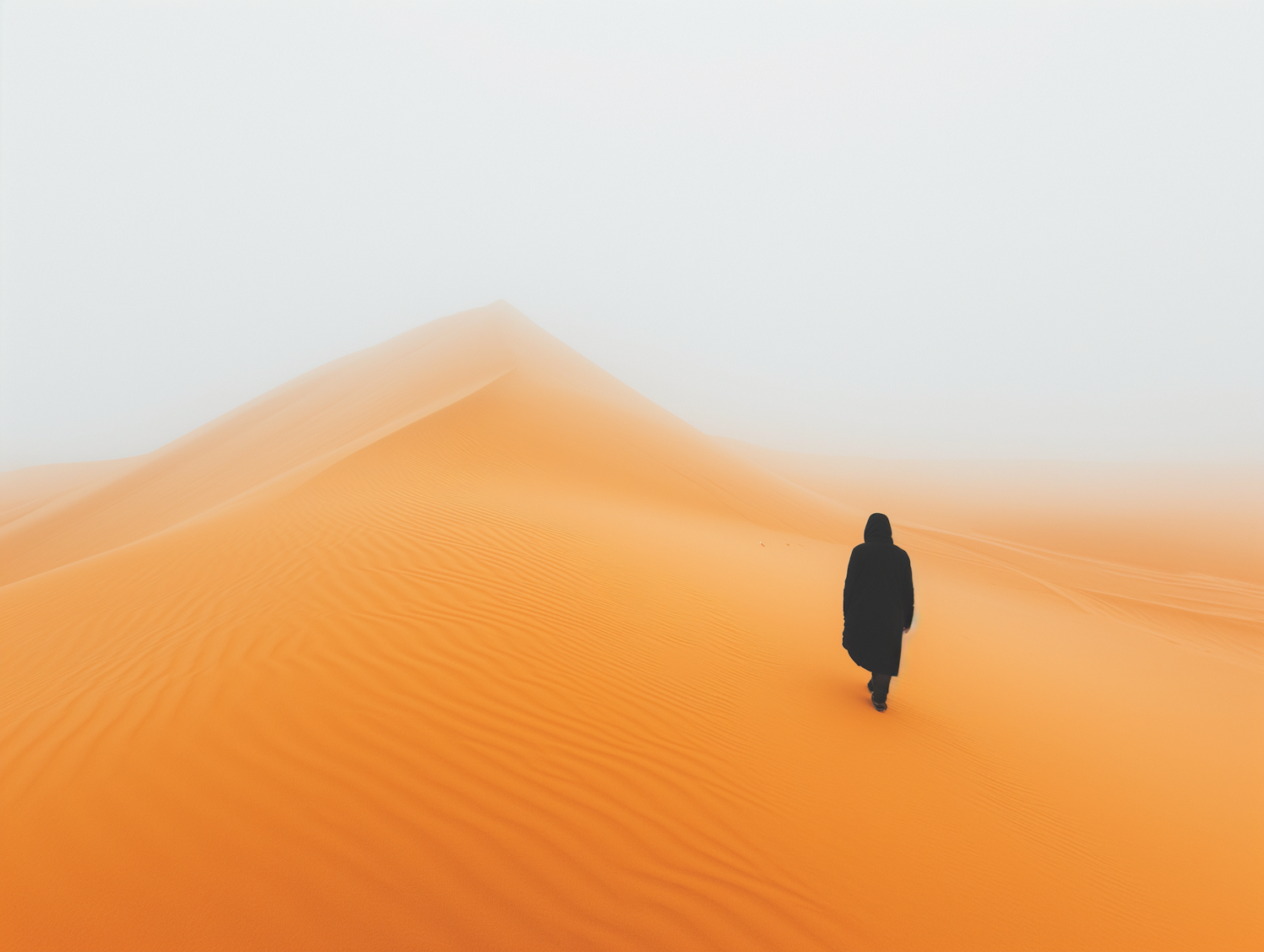 A lone figure in black walks across golden-orange desert dunes under a hazy sky, creating a surreal and contemplative atmosphere.