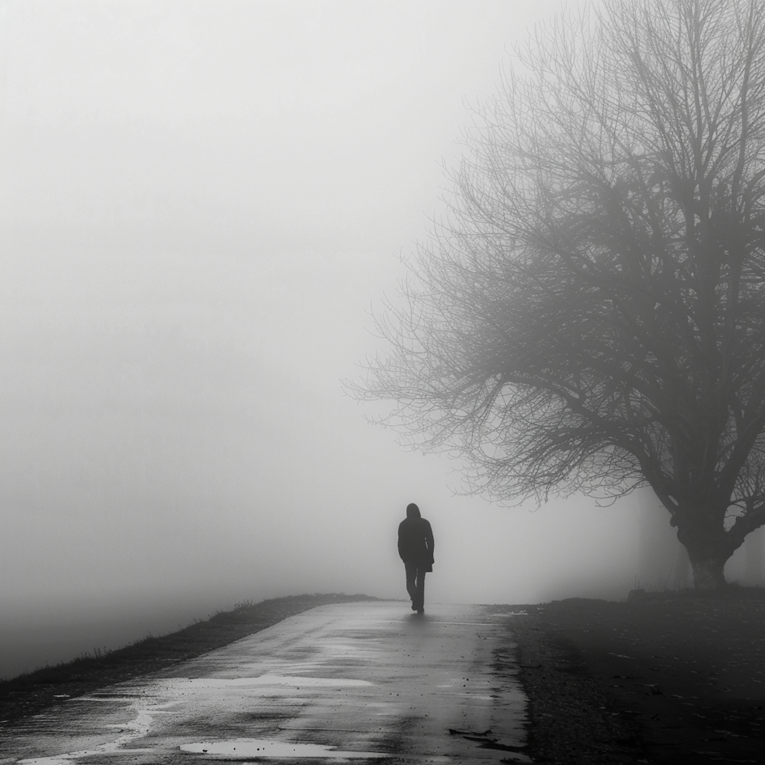 A lone figure walks on a foggy road beside a bare tree, creating a mysterious and somber atmosphere with muted gray tones.