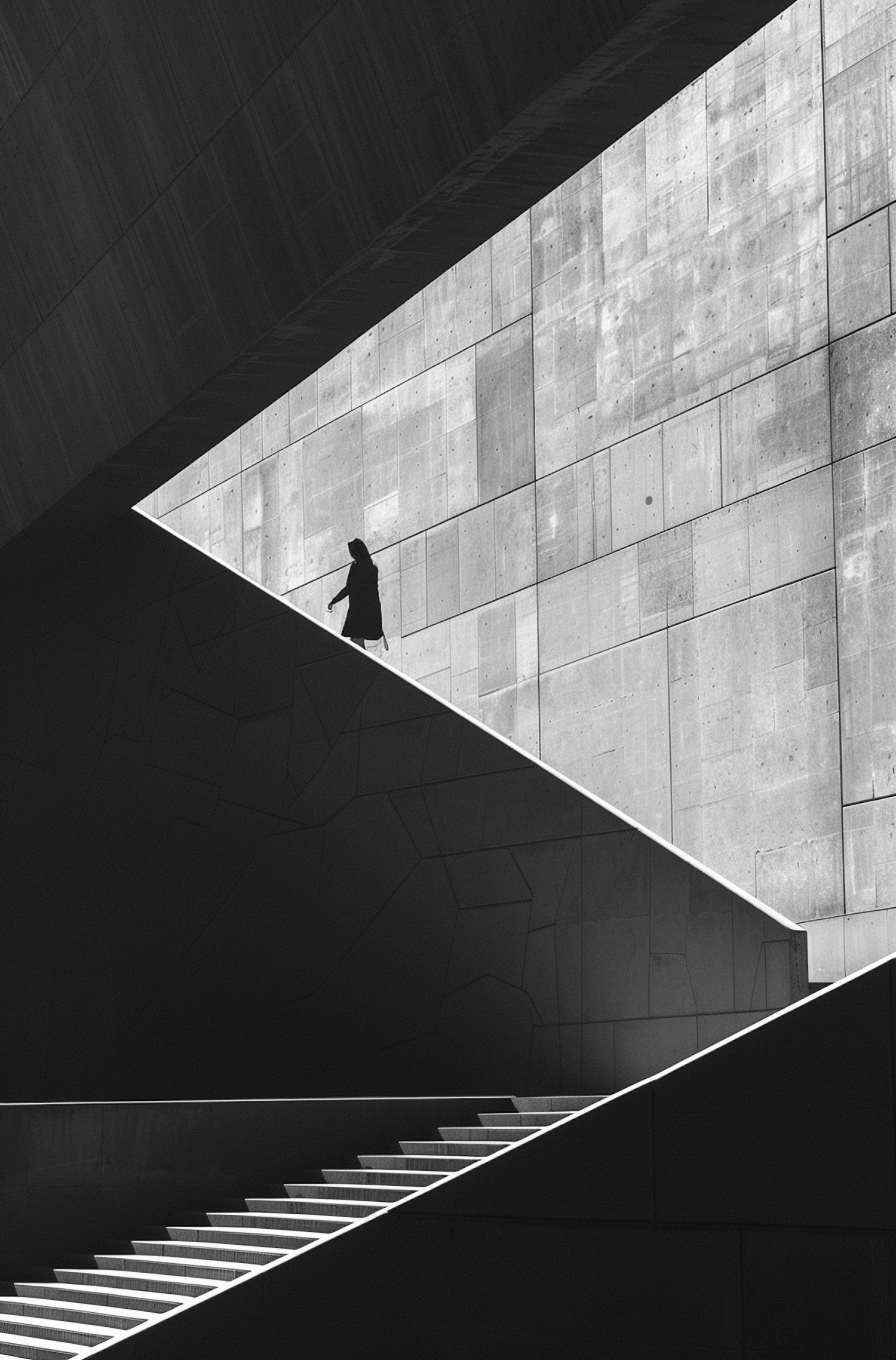 Black and white photo of a person on a geometric staircase against a concrete wall, highlighting modern architecture and solitude.
