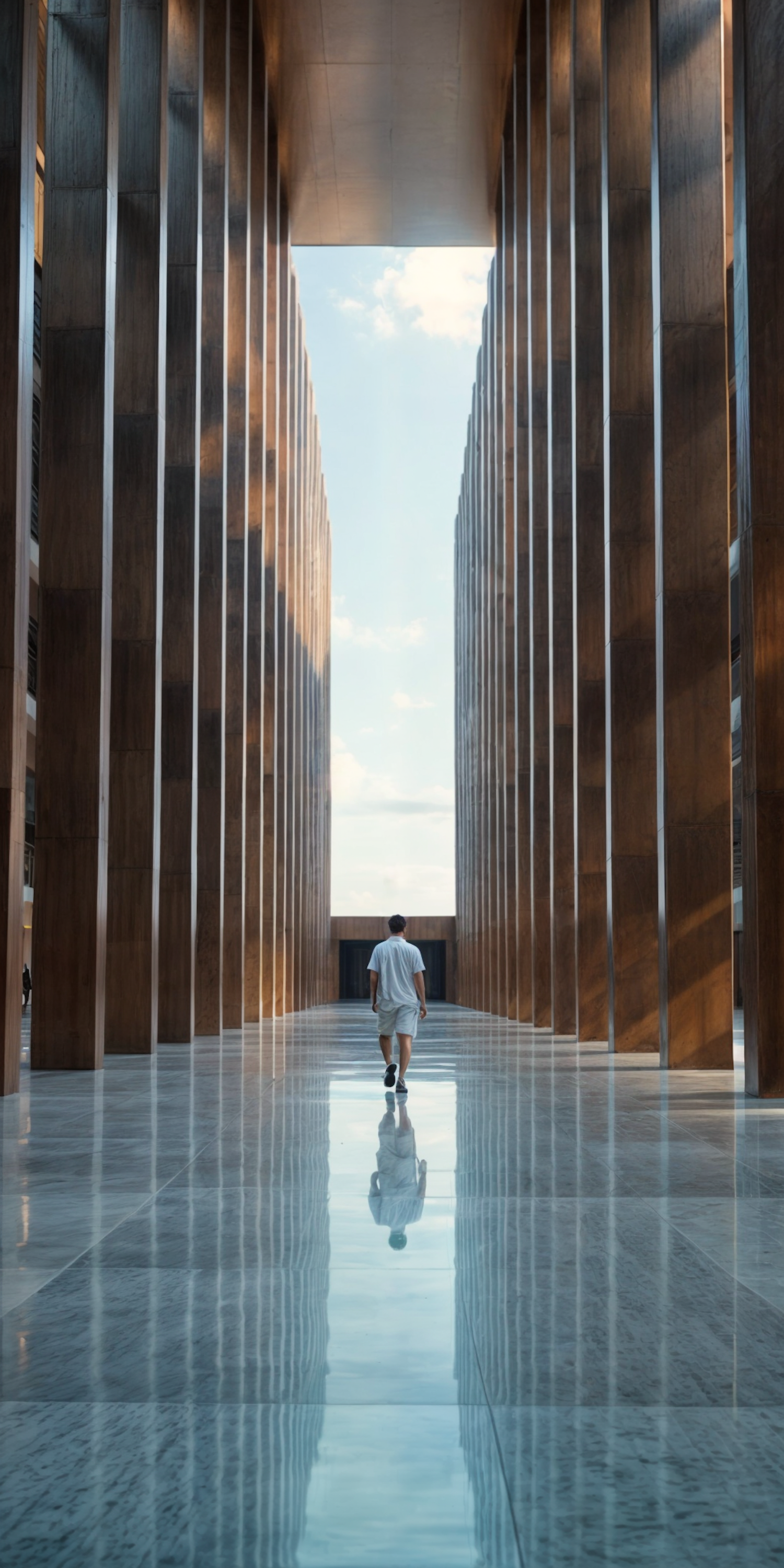 A person walks through a grand corridor with towering wooden columns and reflective floors, leading to an open sky.