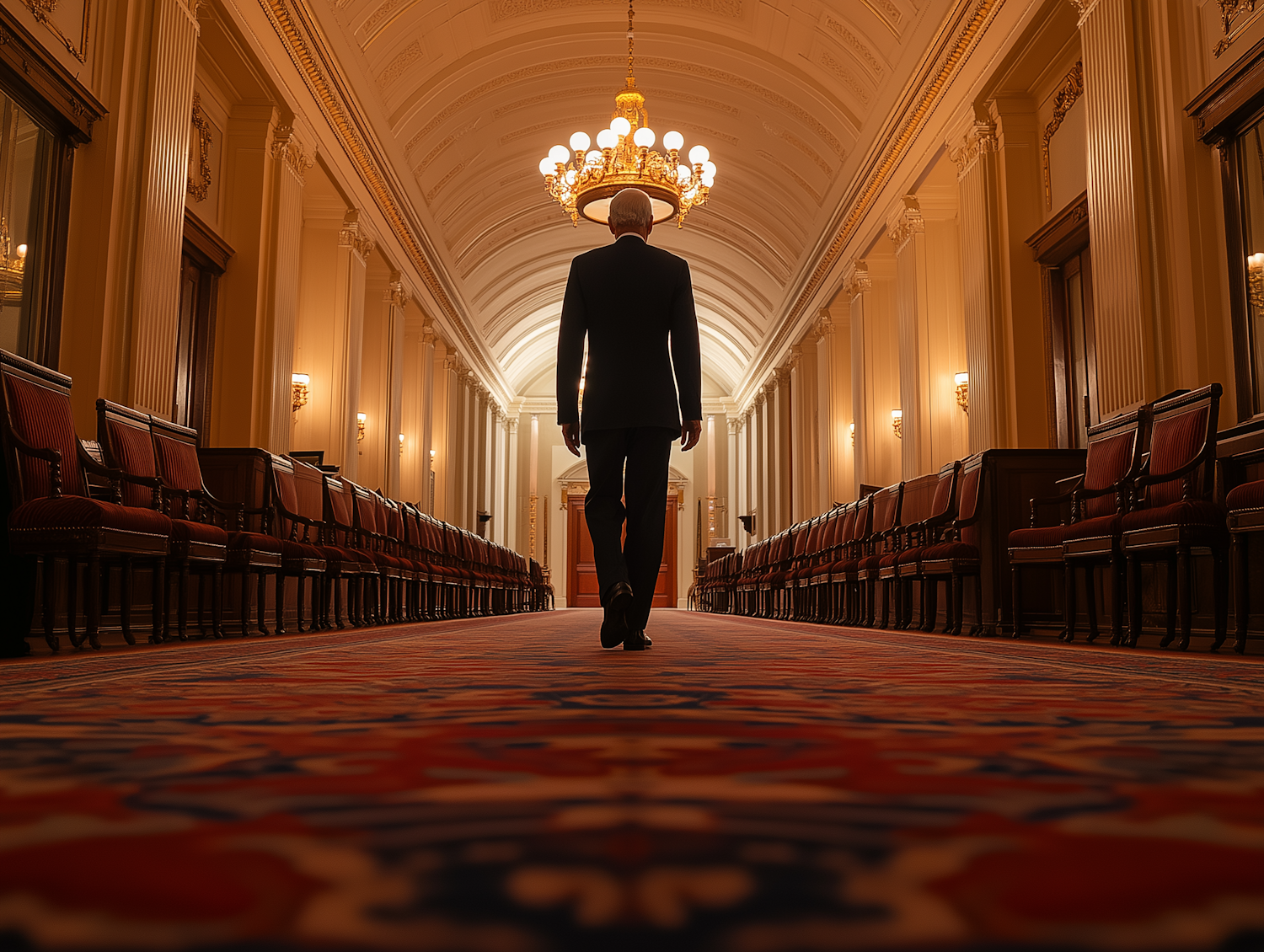 A lone figure in a suit walks down an opulent hallway with chandeliers, columns, and red-upholstered chairs, exuding grandeur and formality.